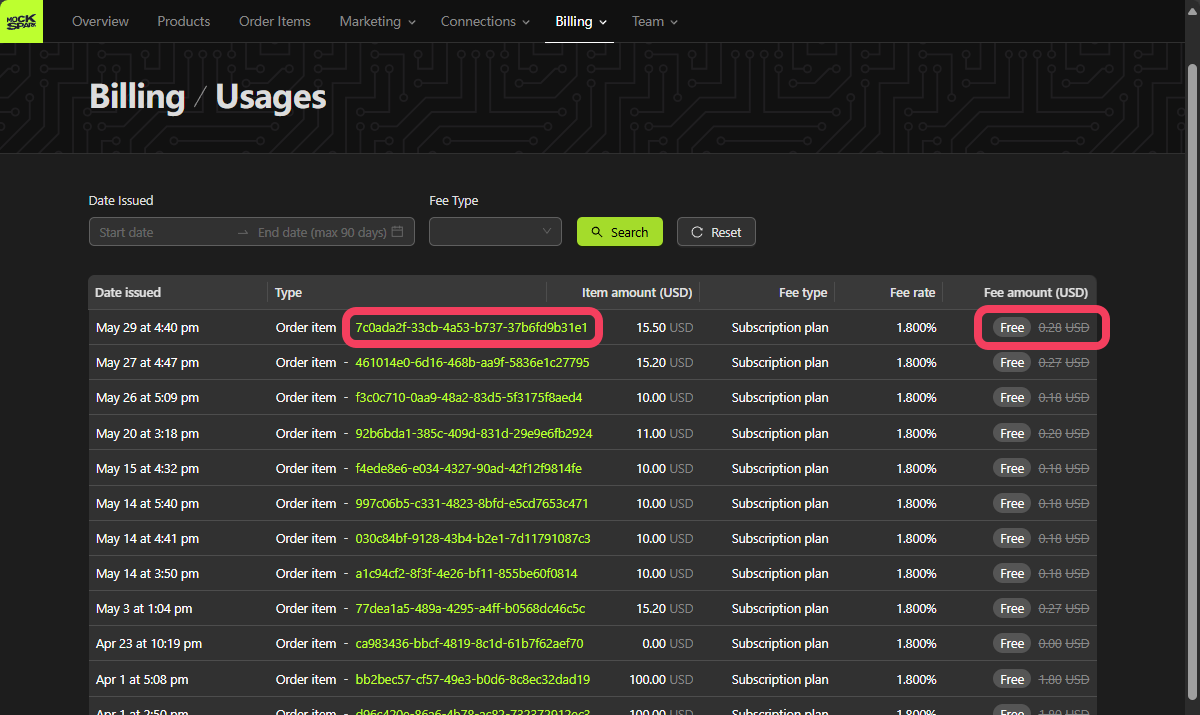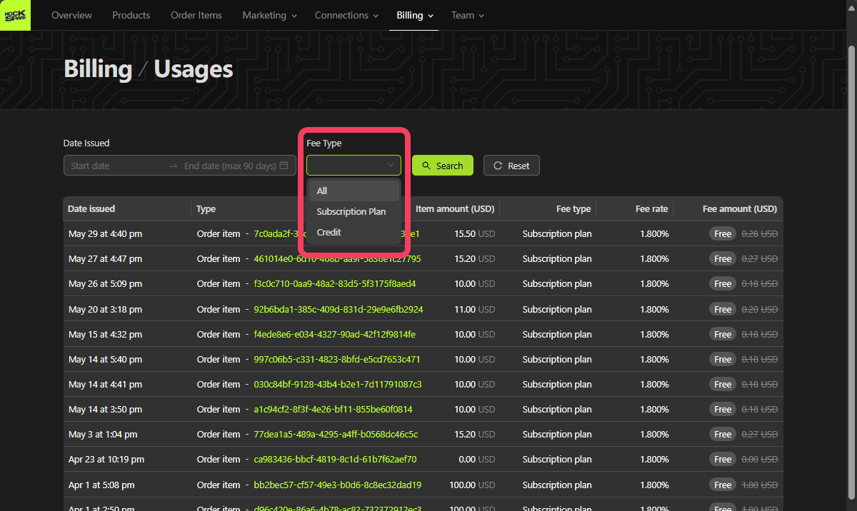 The search area in the Usages section supports the following two filter options:Date Issued: The date and time when the service was used. You can filter by a date range, with support for searching up to the most recent 90 daysFee Type: The Fee Type associated with the service. Supports bothSubscription planandCredit.