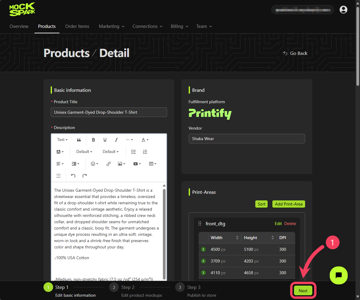 After the product is successfully imported, you’ll be automatically redirected to its edit page. Here, you can customize the basic product details such as the title, description, and variants. However, for the Quickstart tutorial, we recommend keeping the default information provided by the fulfillment platform for now. Click Next to proceed to the next step.