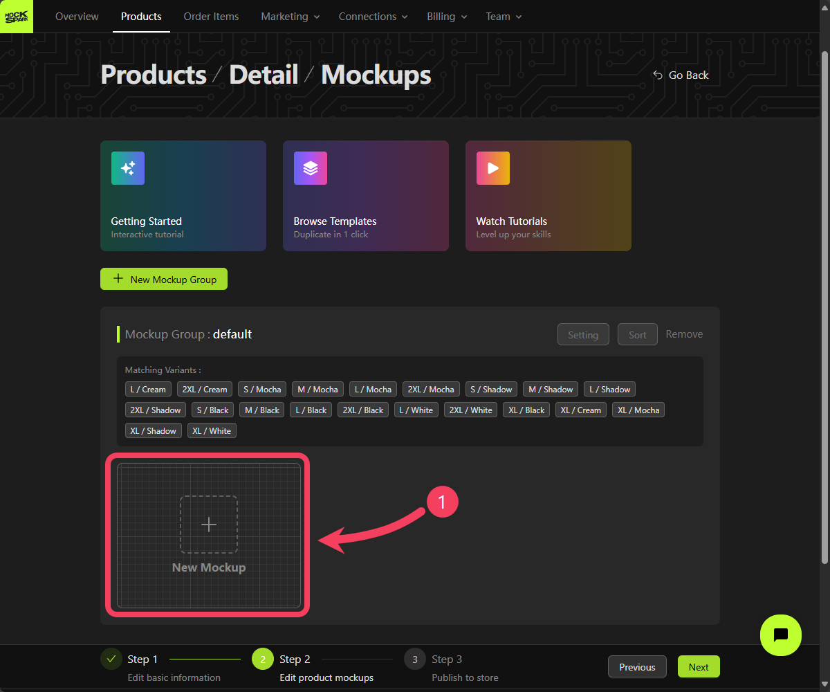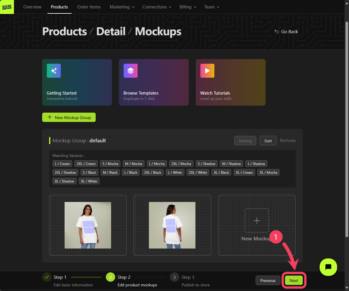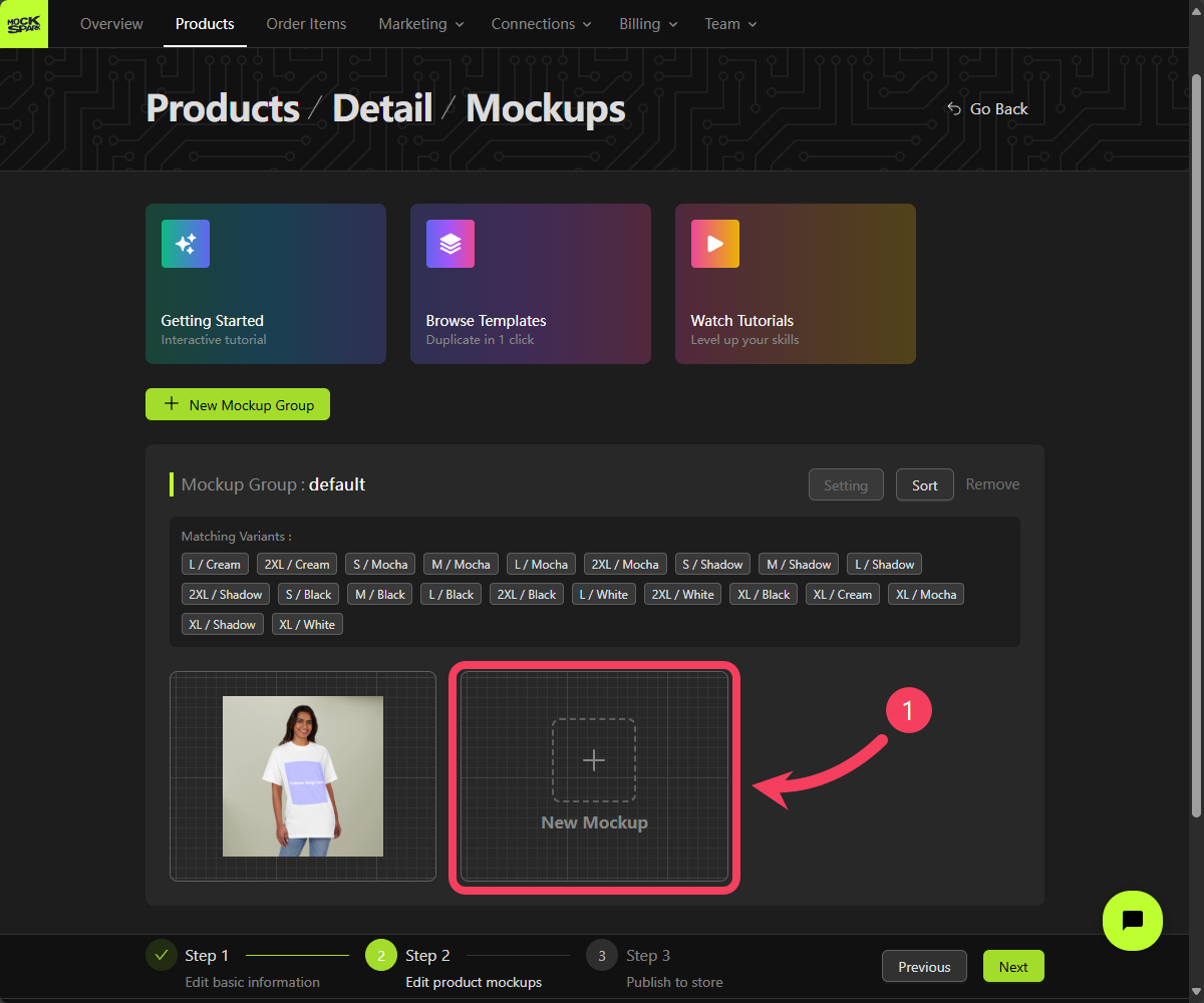 In Mockspark, the Mockup is a core concept at the heart of our customization features. Every design function for customizable products is built around mockups. A customizable product lets you group different variants into separate mockup groups. This is an advanced feature that’s especially helpful when you want to display each color or style with its own specific mockup. But to keep things simple in this quickstart guide, we’ll apply all variants to a single mockup group for now.To explore more about mockups, visit Products tutorial.