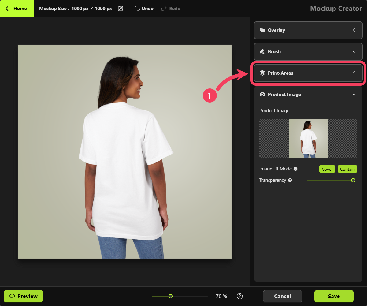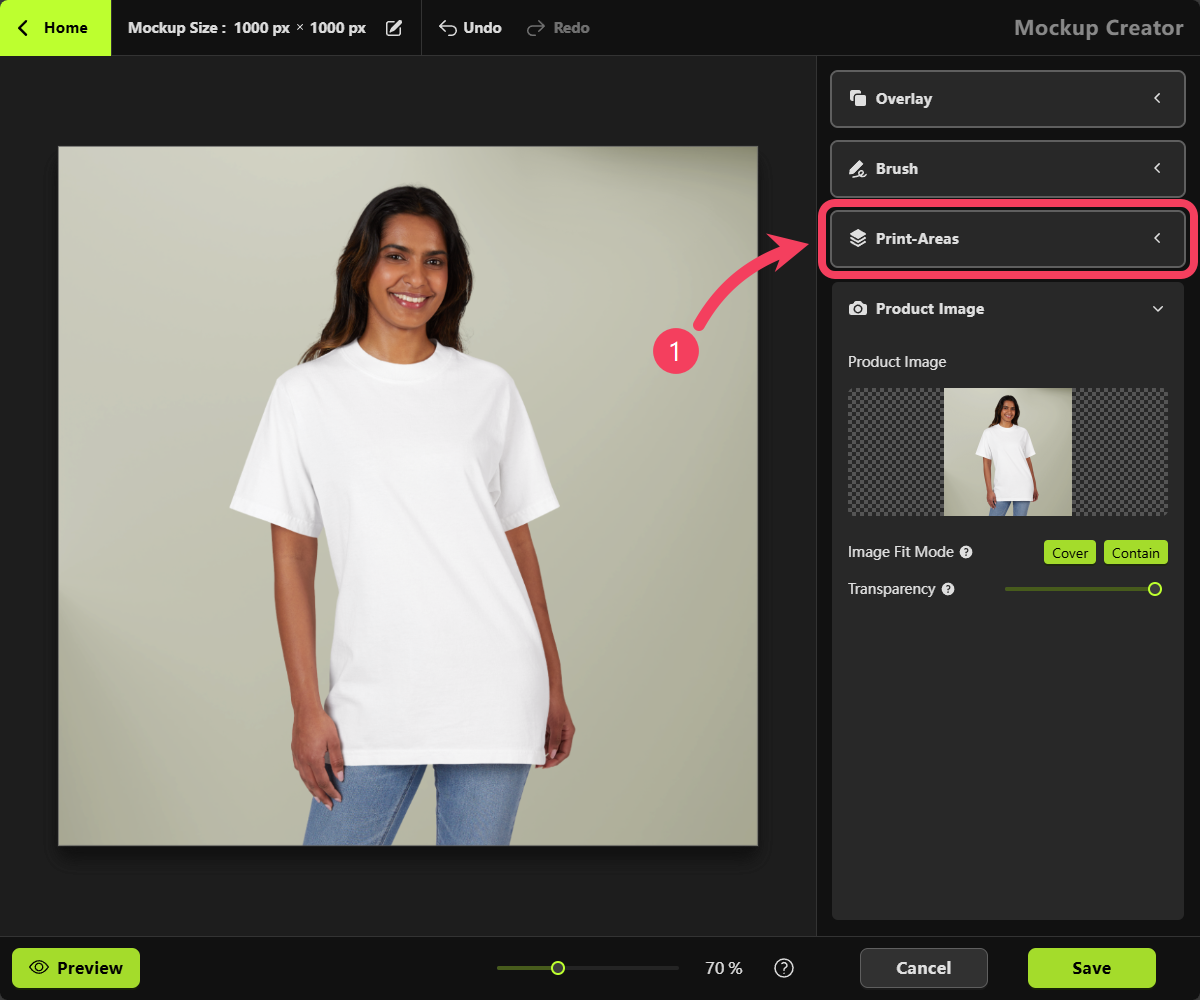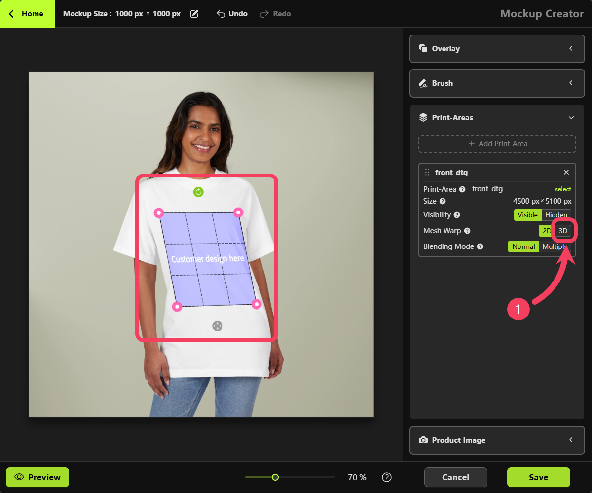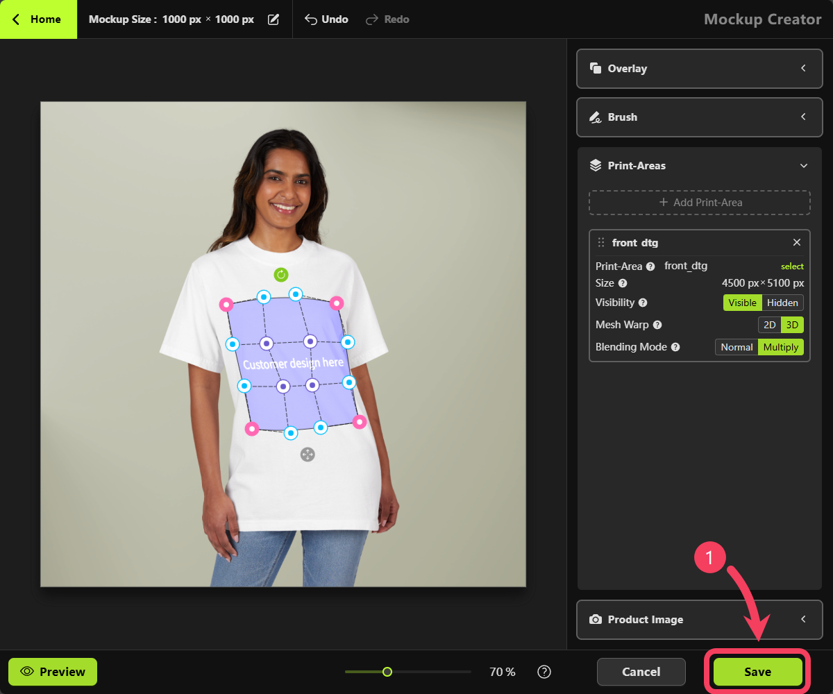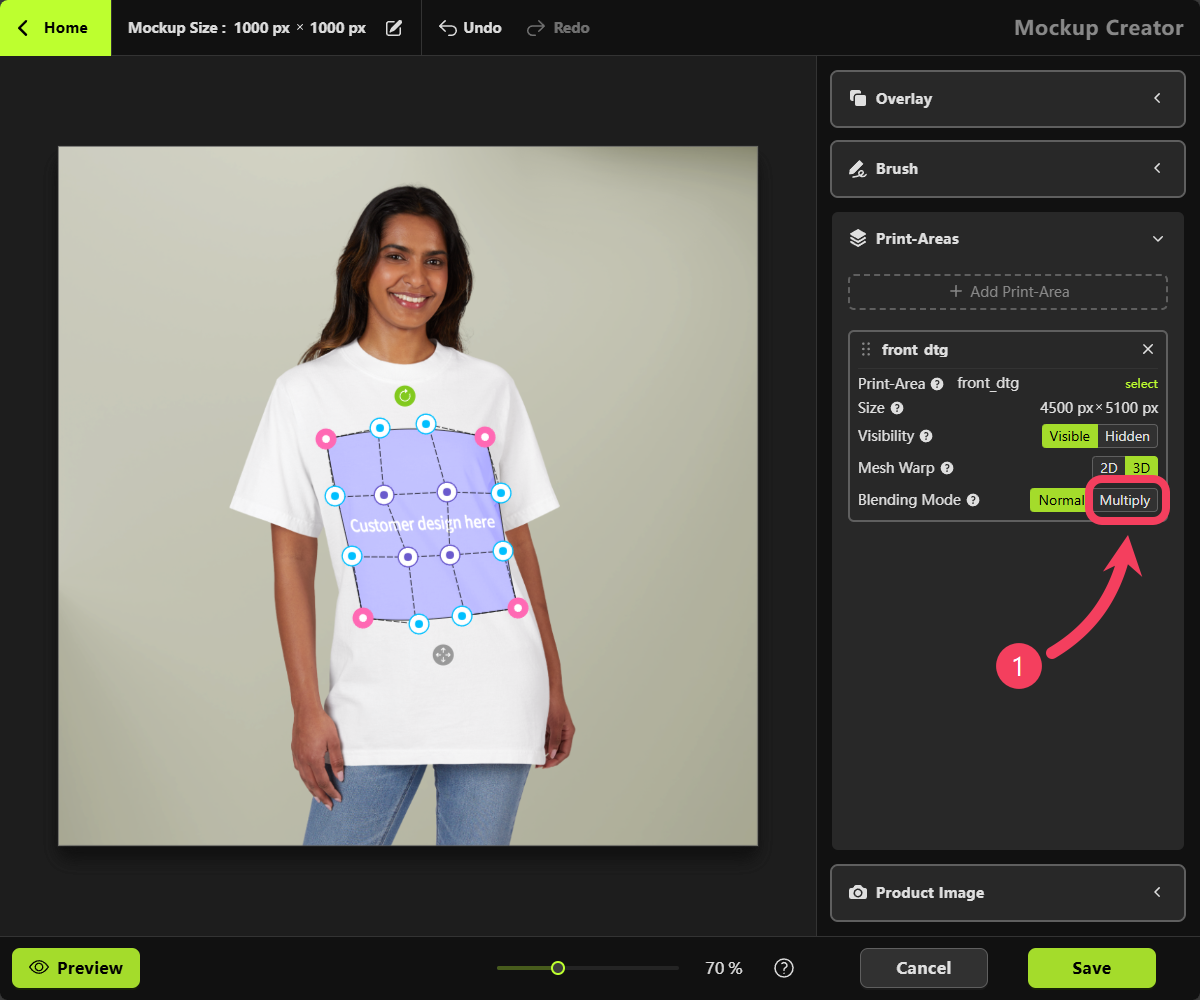 White, we recommend changing the Blending Mode from Normal to Multiply in the Print Areas section on the right-hand panel. This will help enhance the mockup’s visual appearance for a more realistic effect.