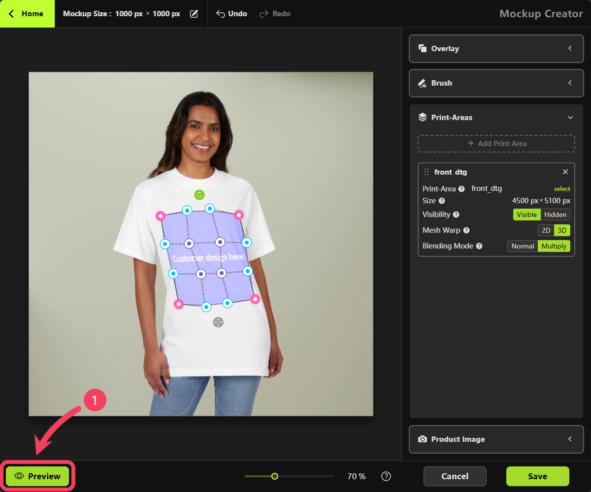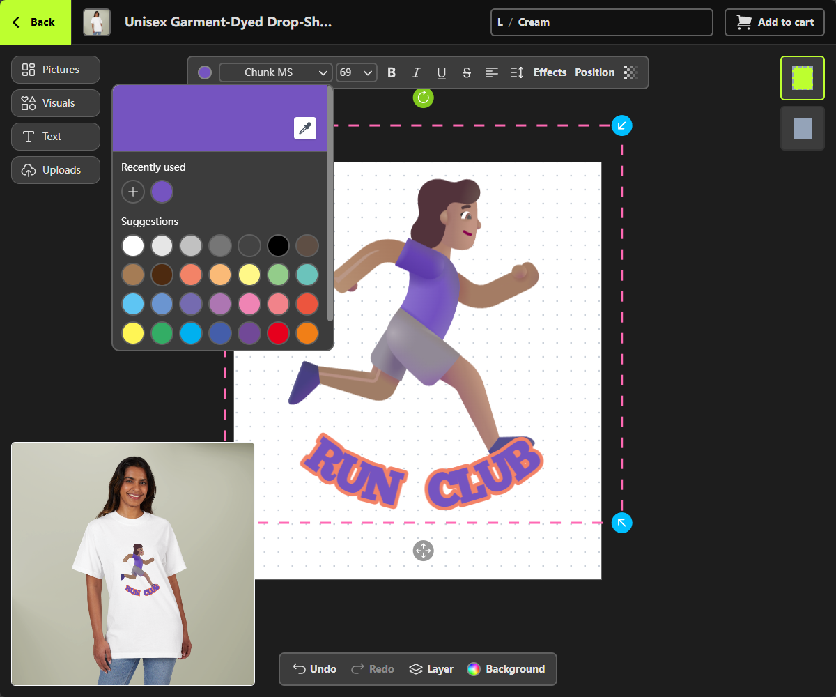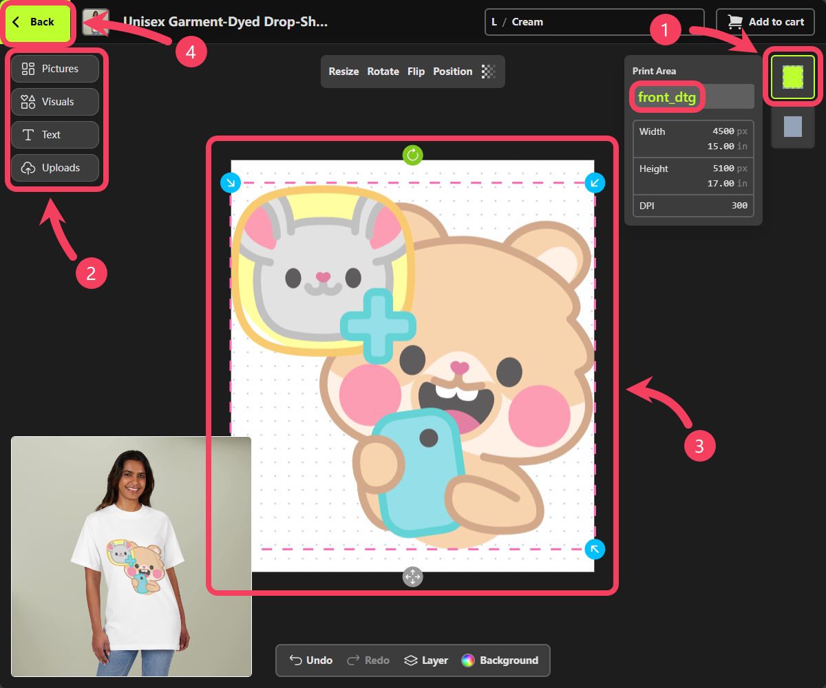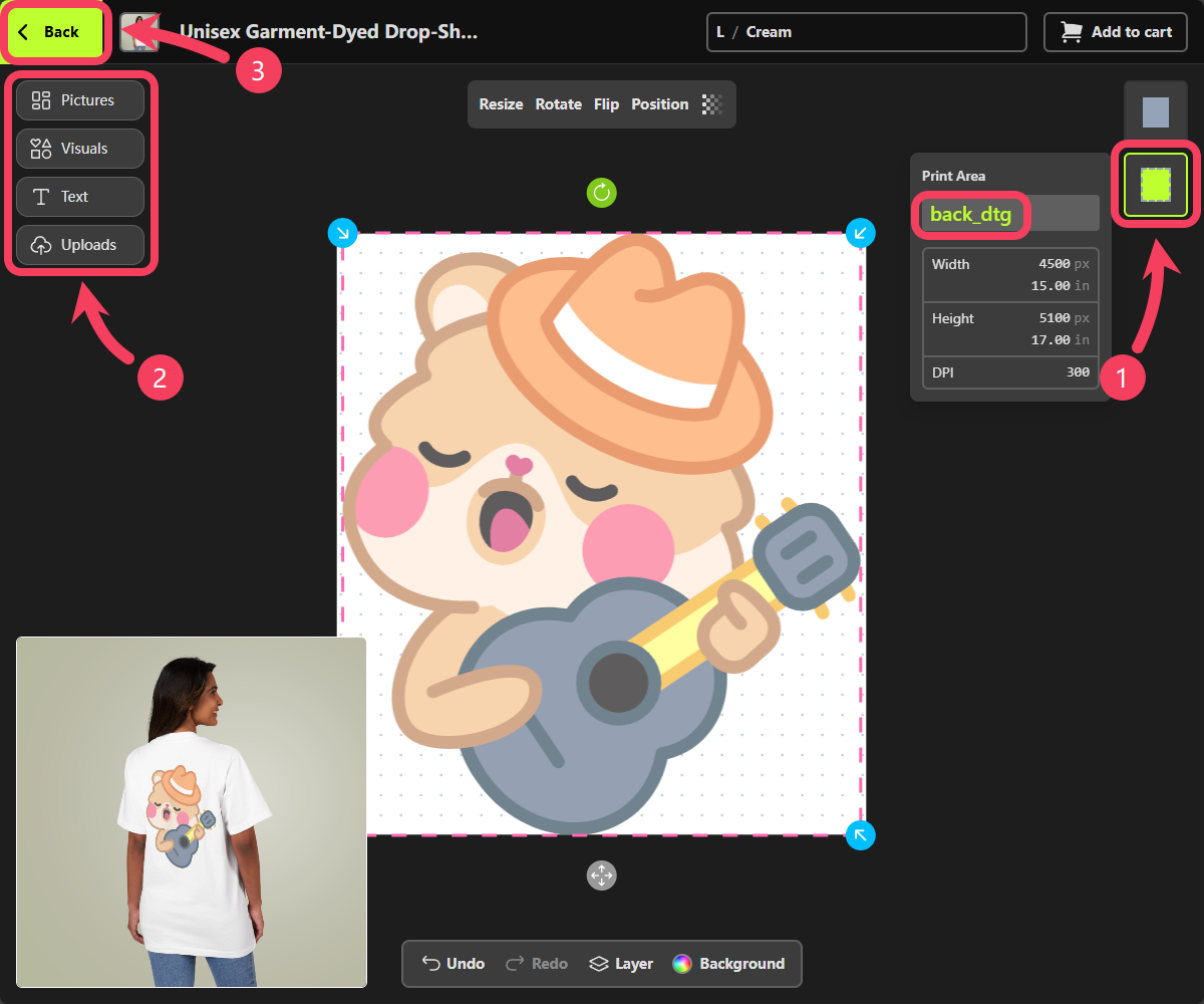 - Adjust your design on the canvas and review the product preview in the bottom-left corner to see if it looks the way you want.