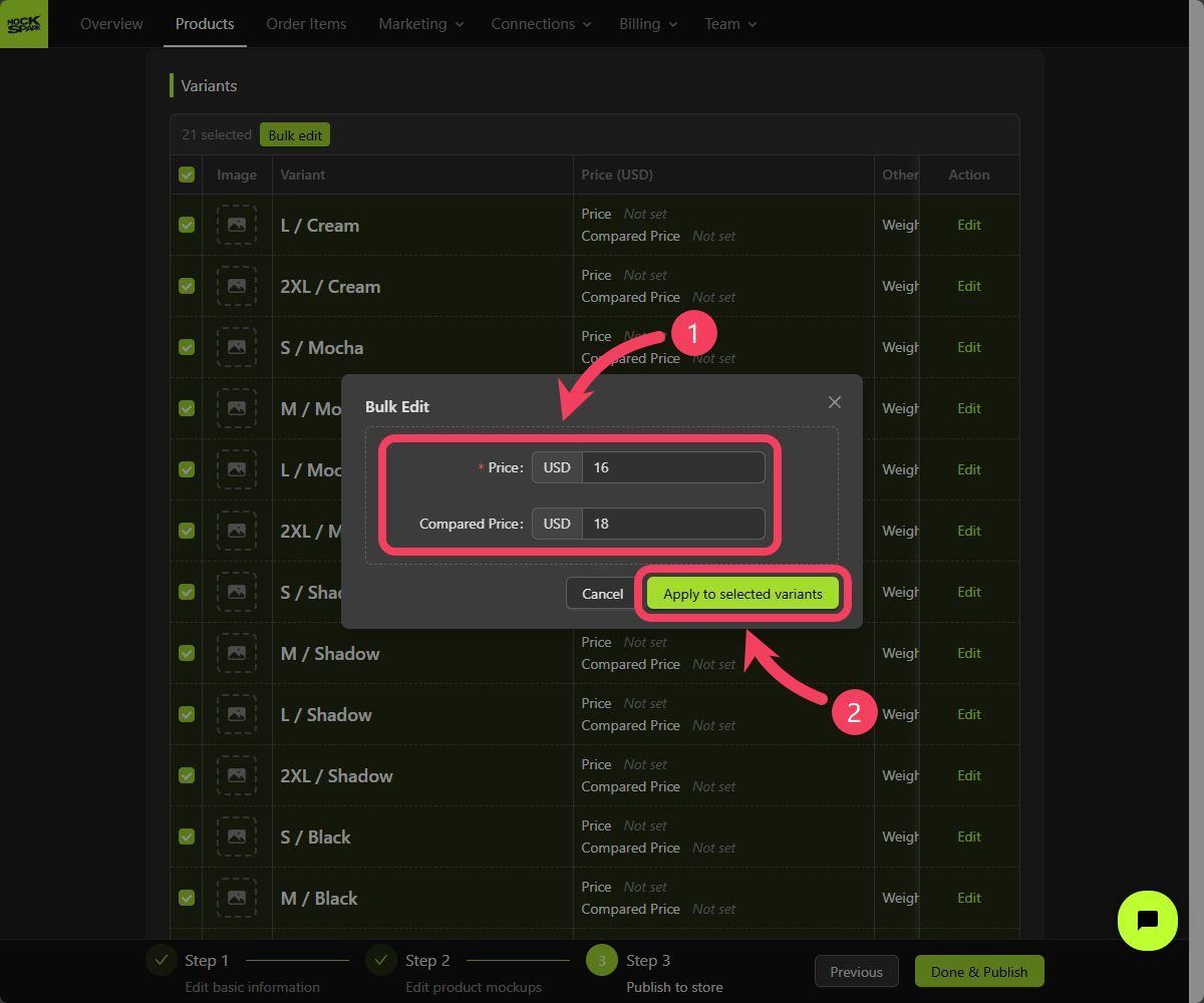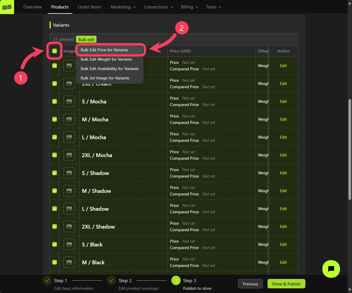 - In the variants table, select all variants by checking the boxes.