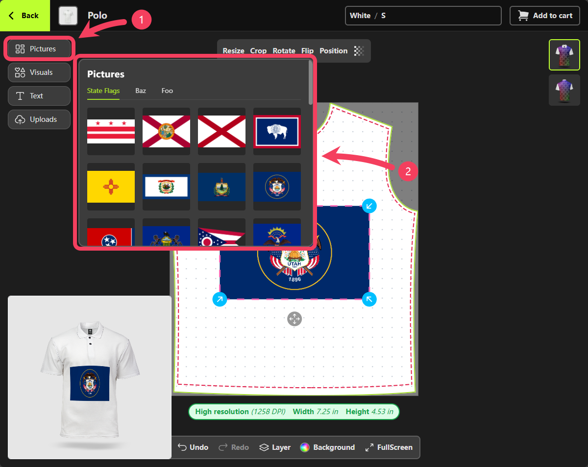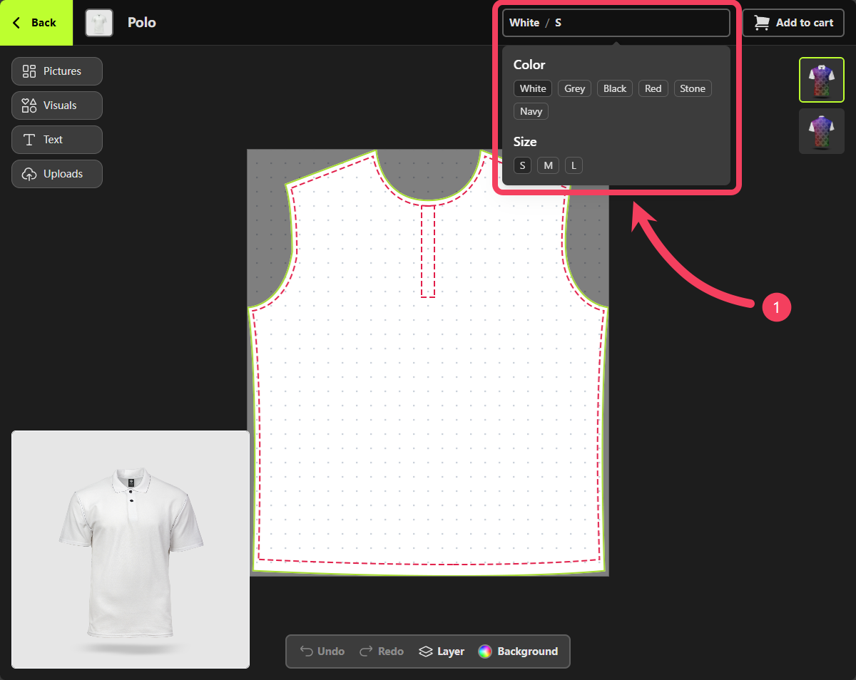 At the top right of the Personalizer, you can view and switch between all available product options, such as color, size, and more.