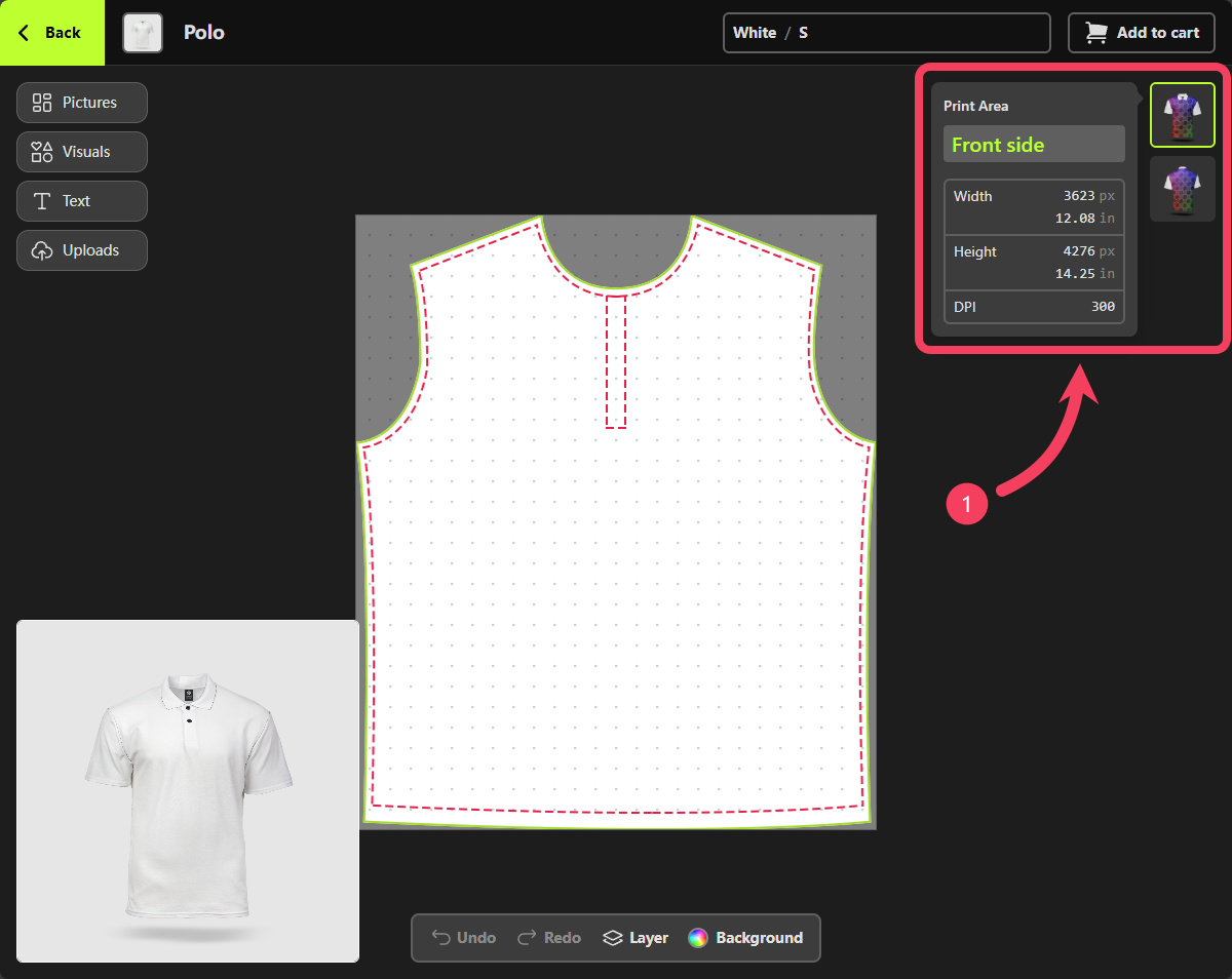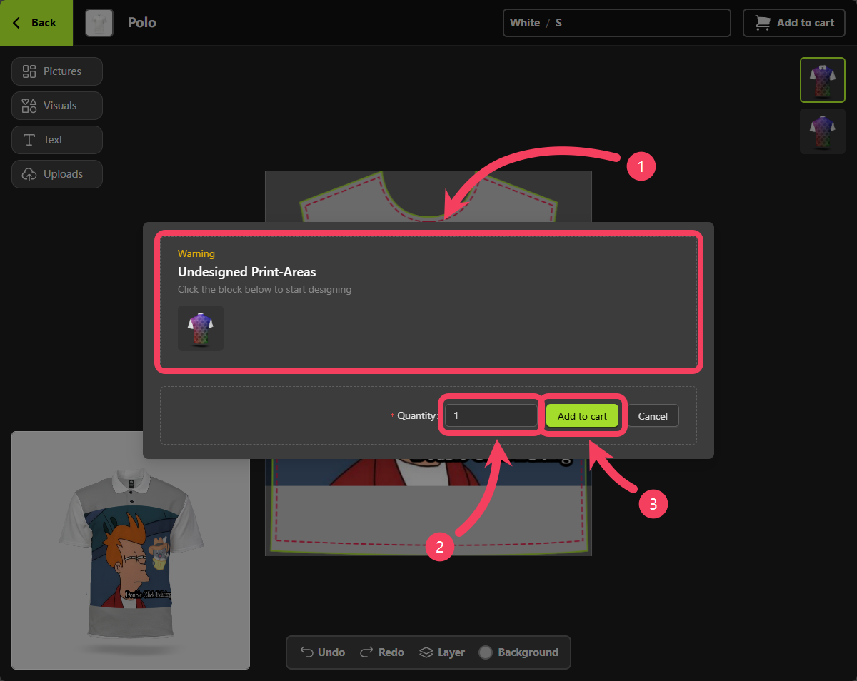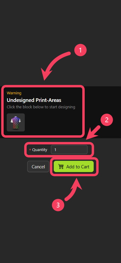 Additionally, if there are any issues such as undesigned Print-Areas or images with poor print quality, the dialog box will alert you. It’s recommended that you make adjustments to your design based on these alerts to ensure better print results.