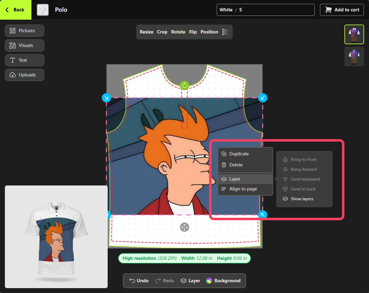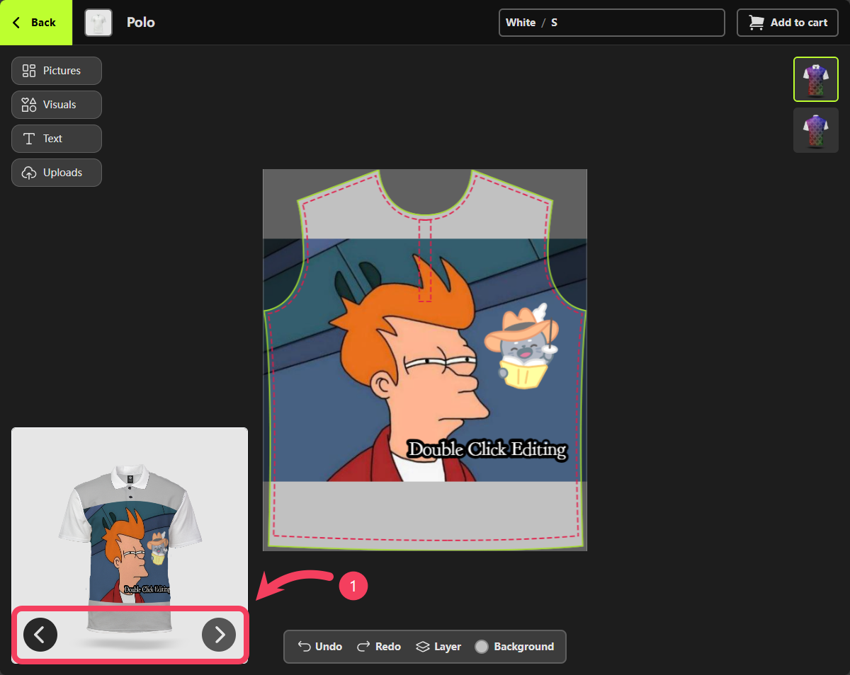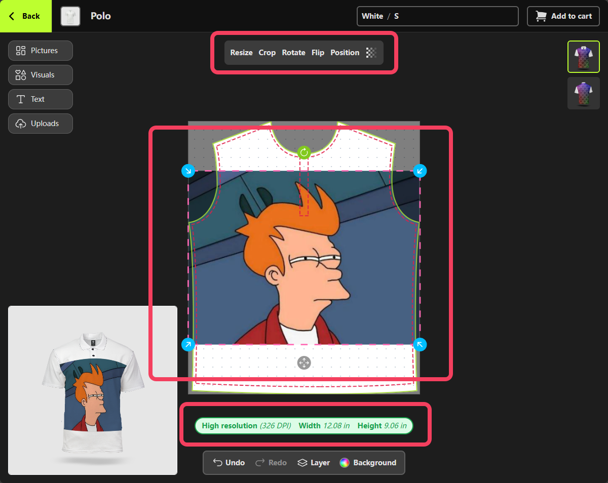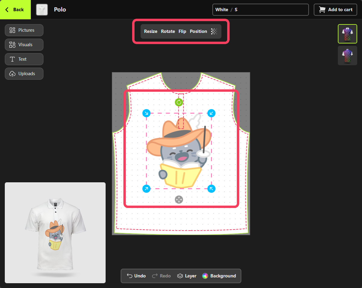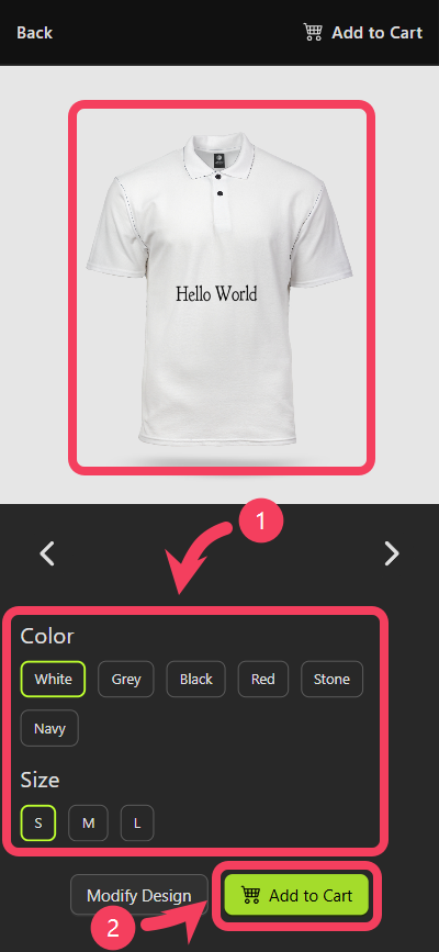 Preview interface, you can not only see your design but also view and switch between all available product options, such as color and size.