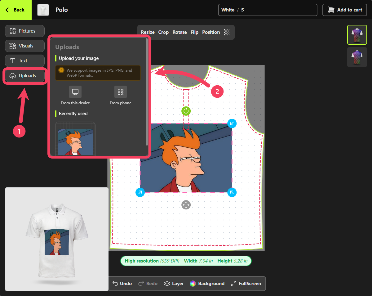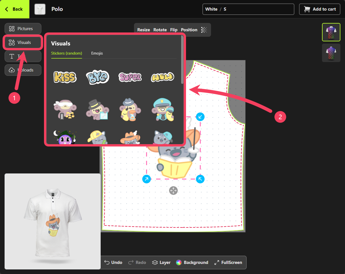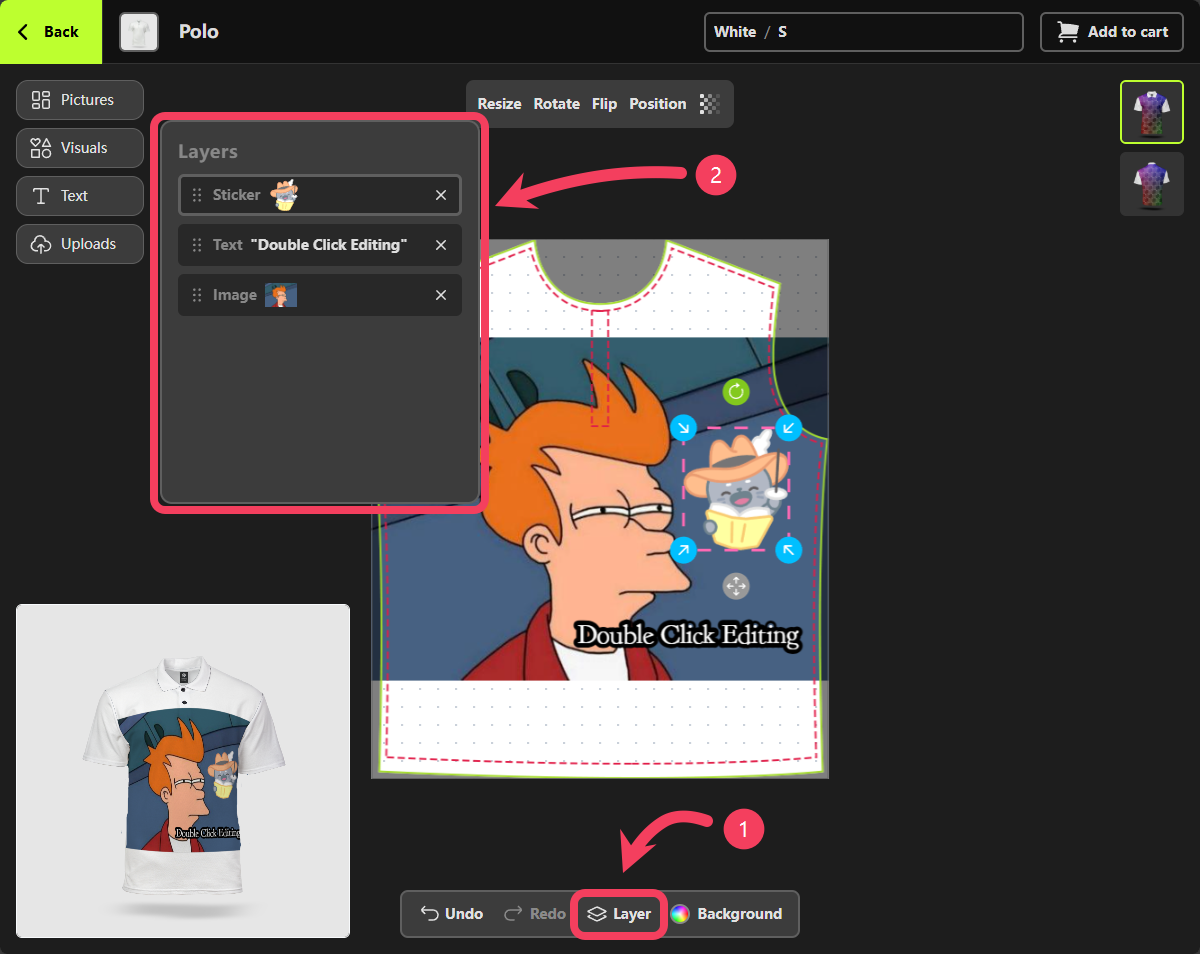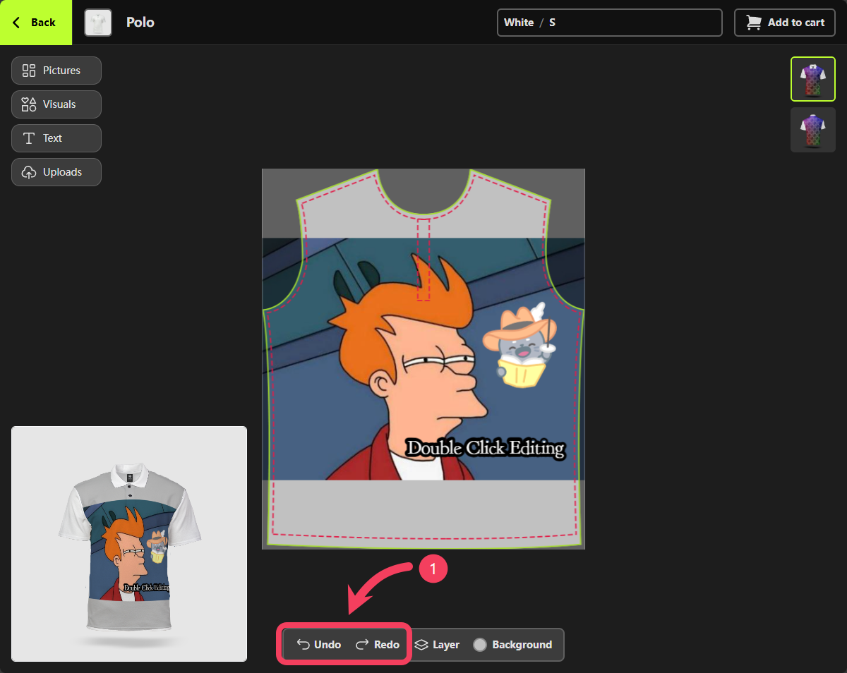 Preview interface, you can not only see your design but also view and switch between all available product options, such as color and size.