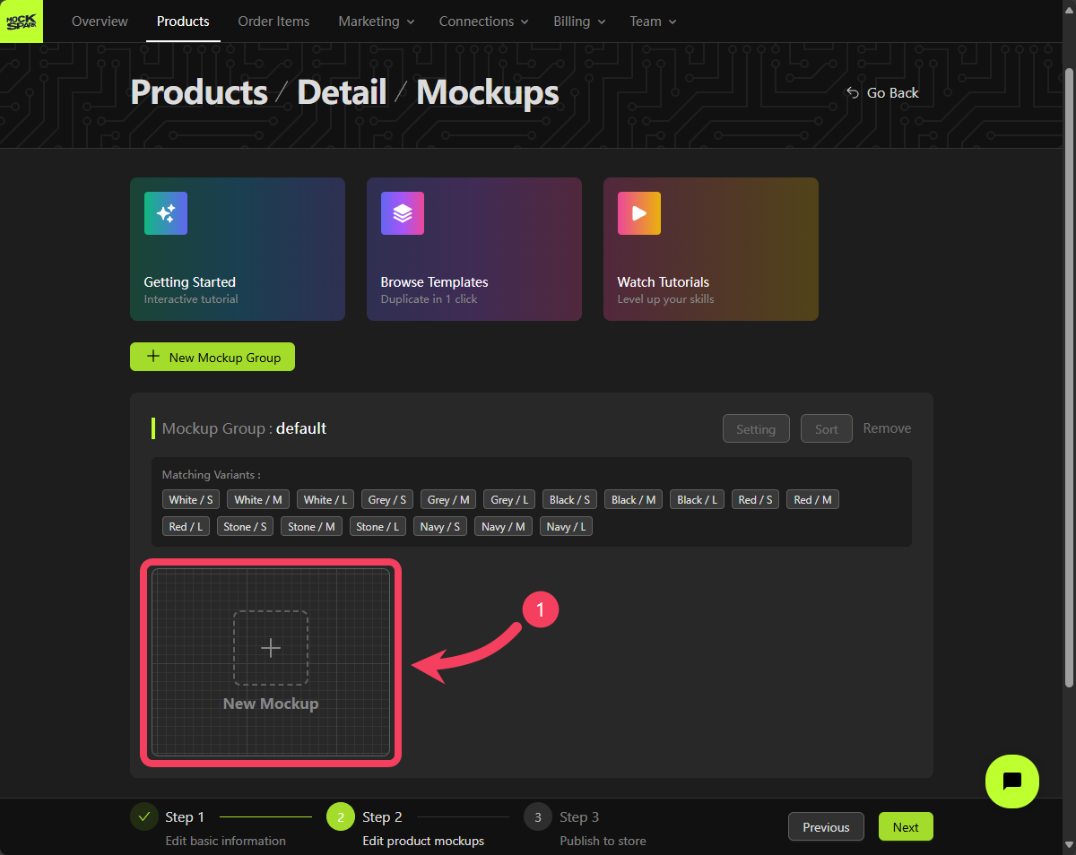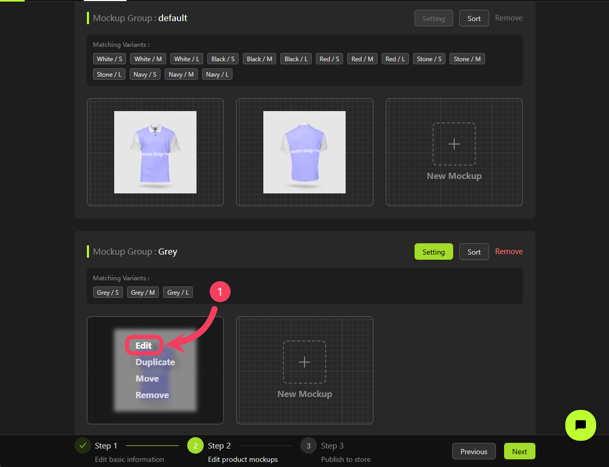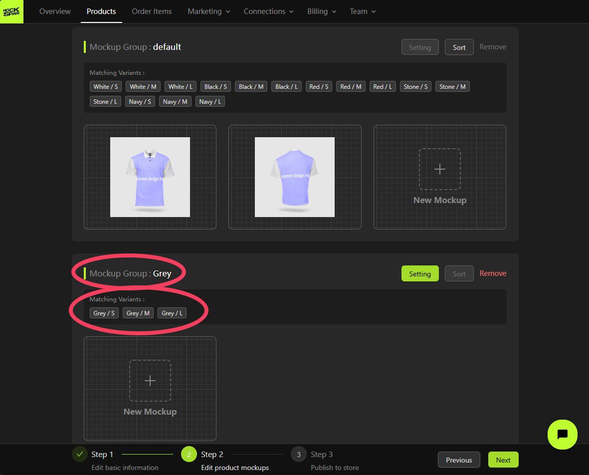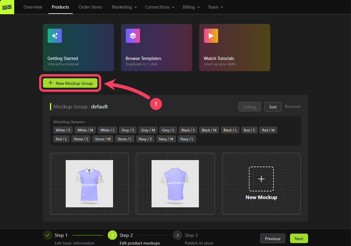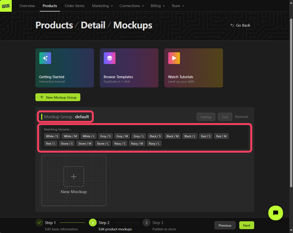 On the Step 2 screen, you’ll see a Mockup Group that includes all product variants. This is a system-generated group nameddefault.
