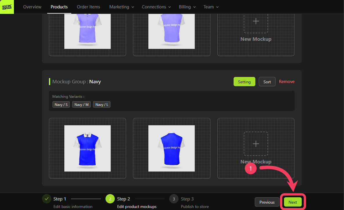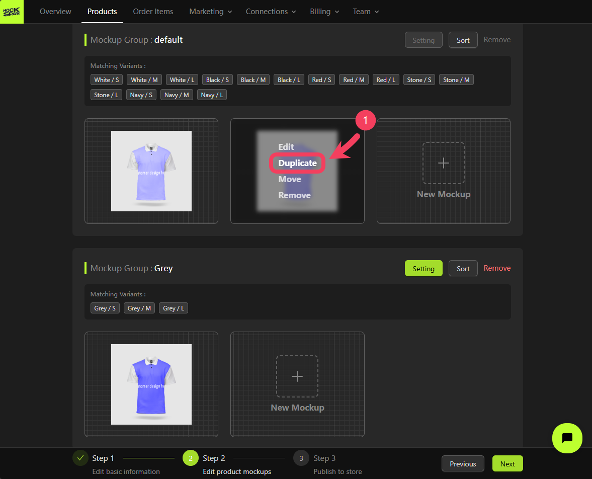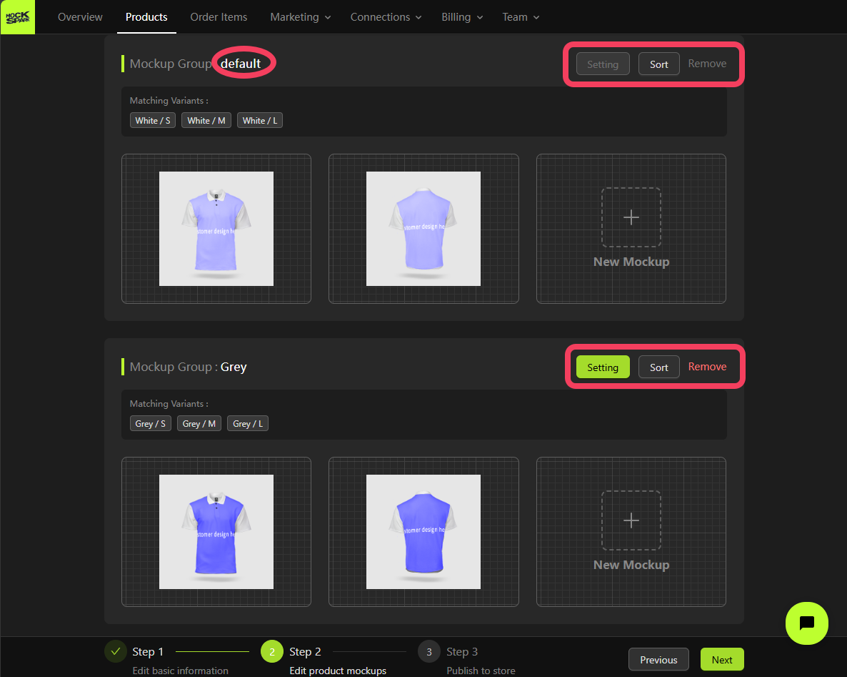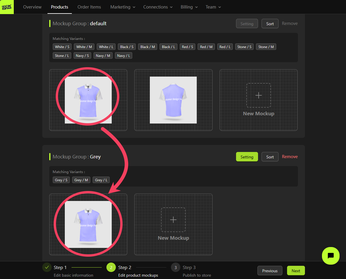 On the Step 2 screen, you’ll see a Mockup Group that includes all product variants. This is a system-generated group nameddefault.