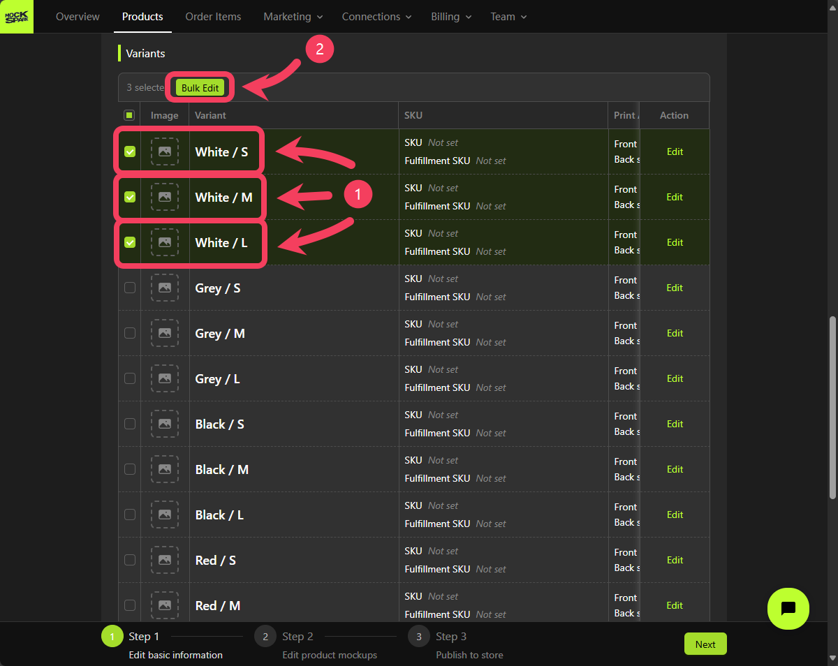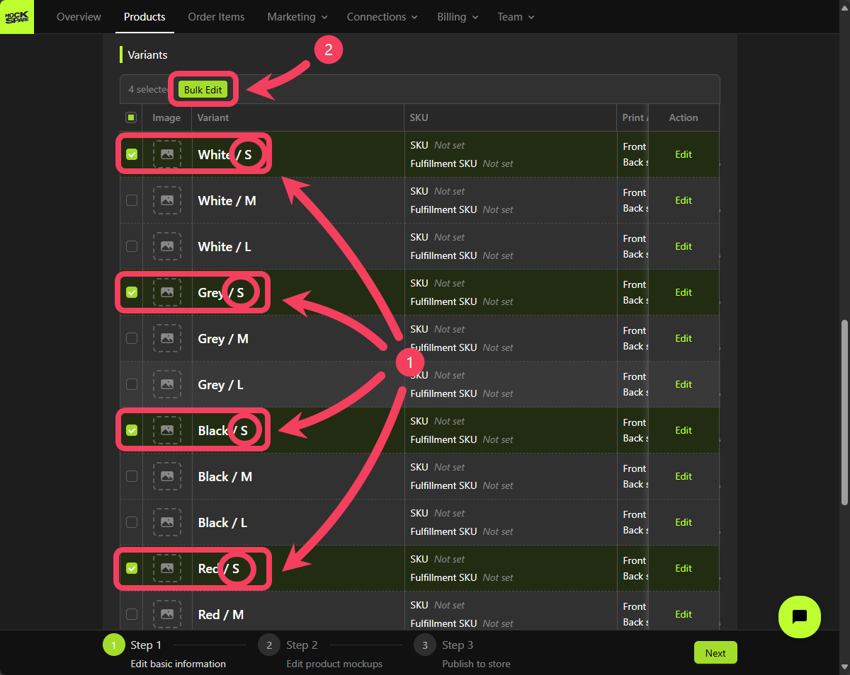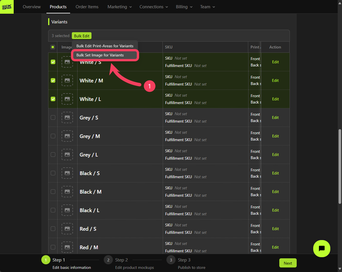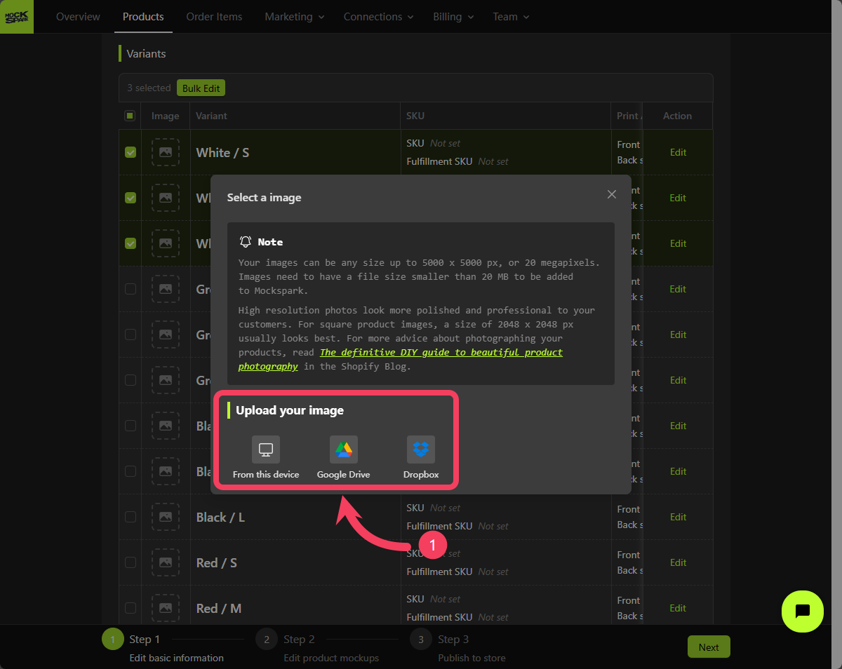 On the Step 2 screen, you’ll see a Mockup Group that includes all product variants. This is a system-generated group nameddefault.