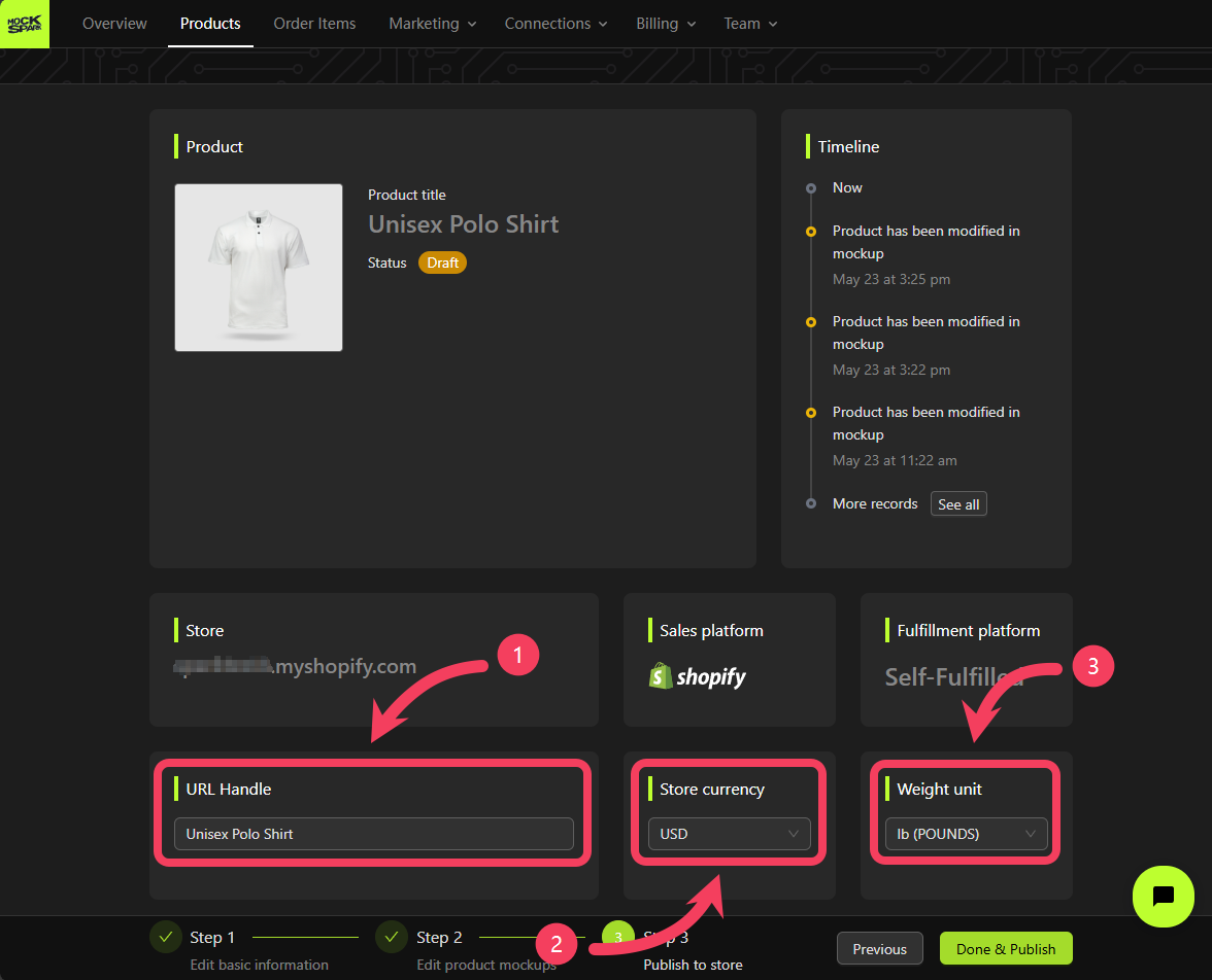 You can edit settings such as the product URL handle, Store currency, and Weight unit:URL Handle: A unique, user-friendly text based on your product title. It’s used to create the product’s web address in your online store.Store currency: It’s pulled directly from your Shopify store settings. To change the currency, simply update it in your Shopify Admin panel. For more details, visit: Shopify Help Center | Changing your store currencyWeight unit: The unit of weight used for this product.