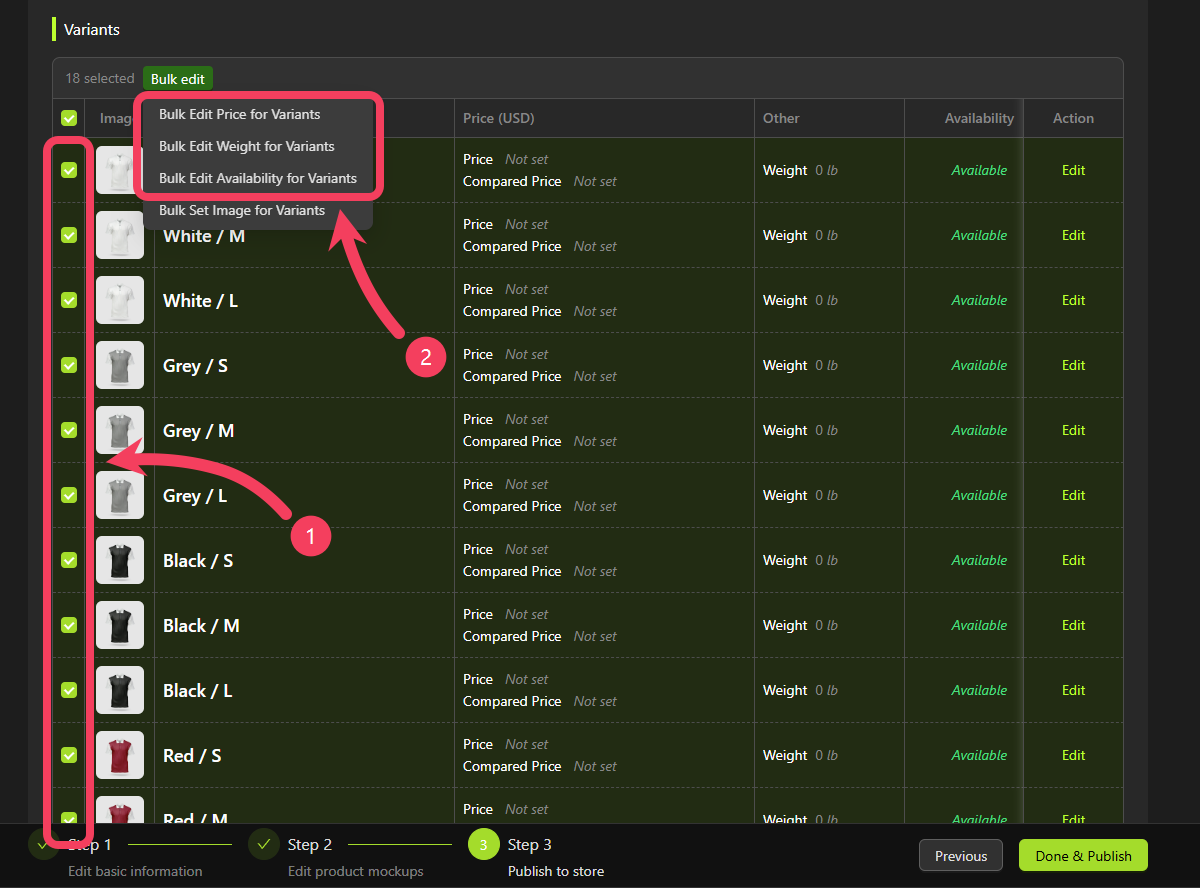 - In the Variants table, select all variants with the color set to