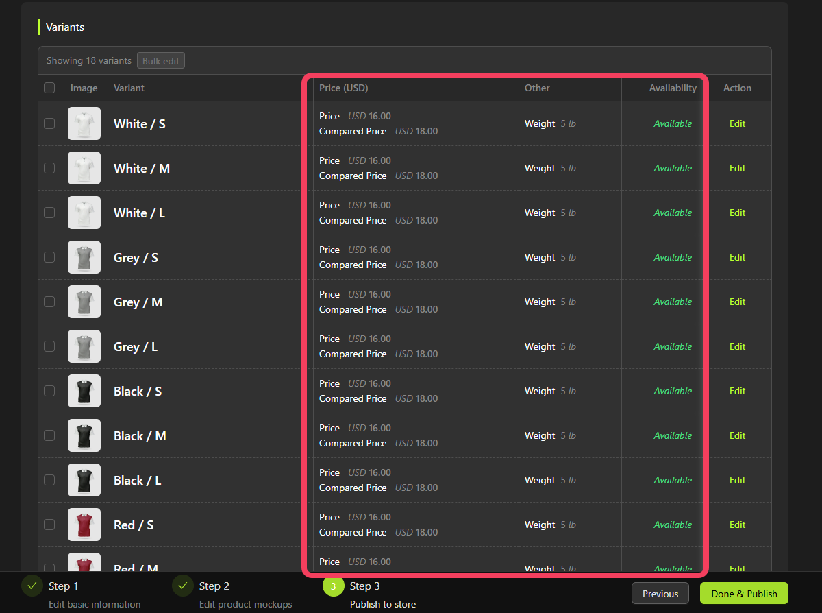 In the Variants table, you can view all the different versions of your product.