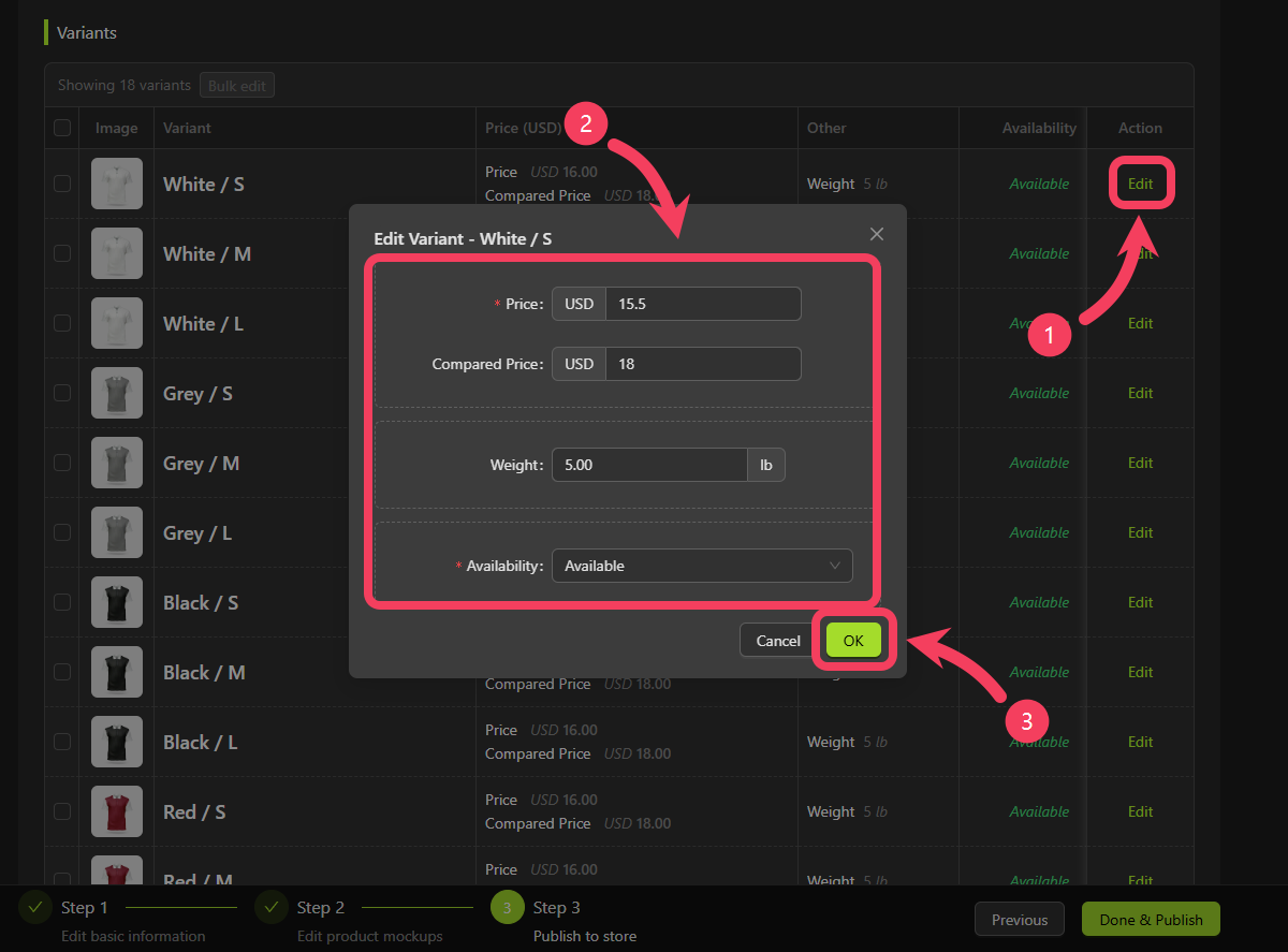 rowfor the variant you want to edit, click Edit. - Update the information for that variant as needed.