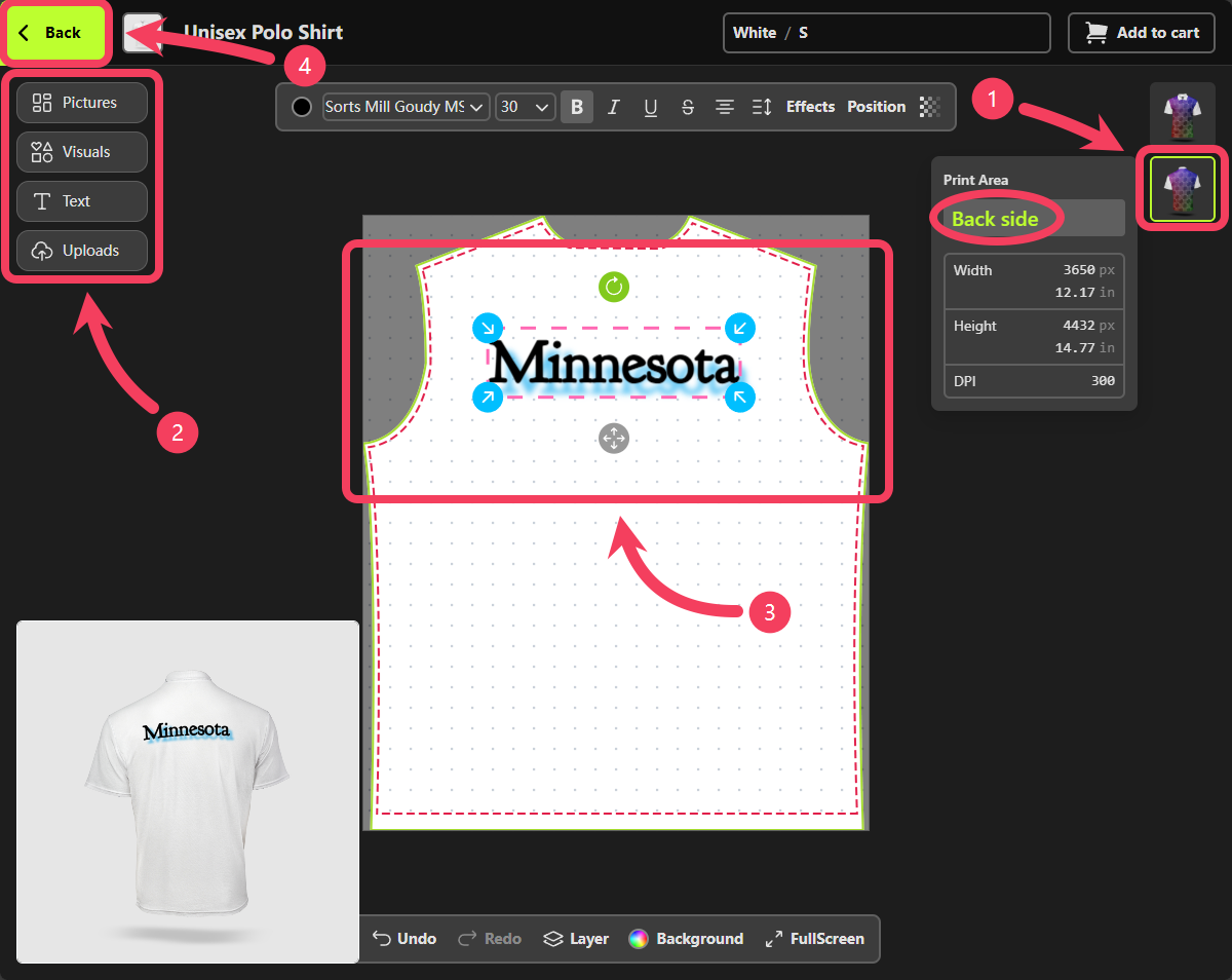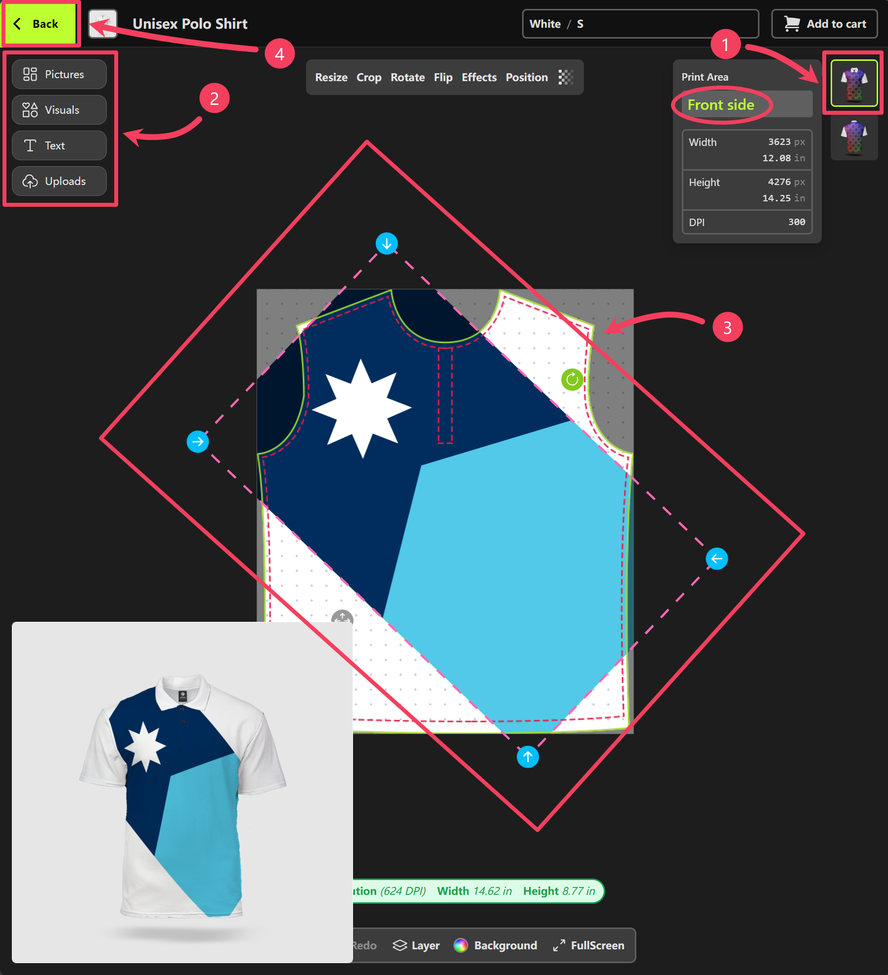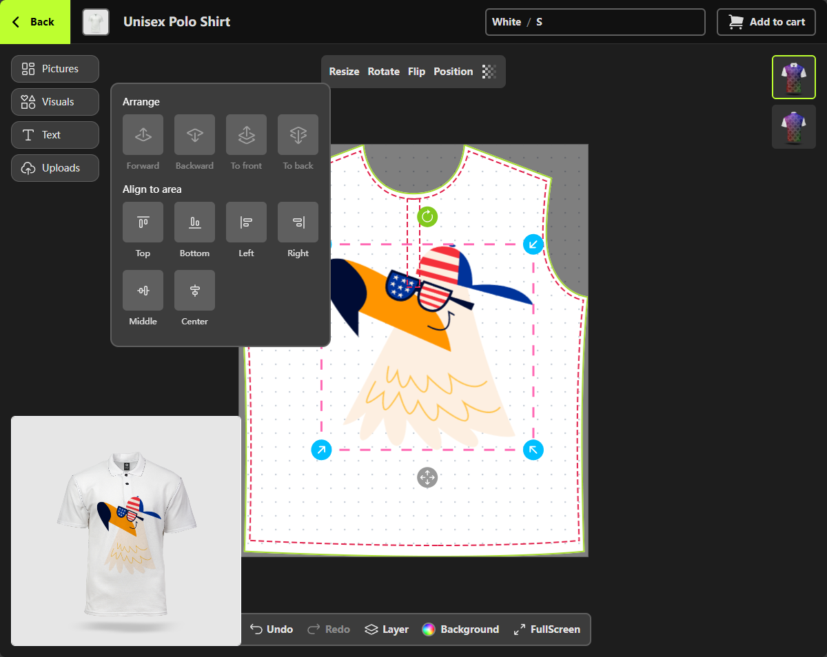 - Adjust your design on the canvas and review the product preview in the bottom-left corner to see if it looks the way you want.