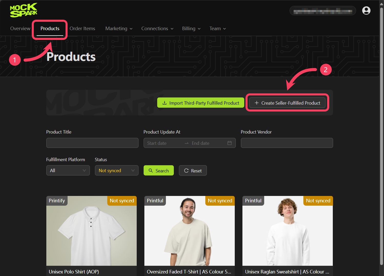 Seller-Fulfilled Products include items that the seller handles independently. This means the seller is responsible for providing product information, managing production, and shipping orders. It also includes products fulfilled through third party services that are not currently connected to Mockspark.