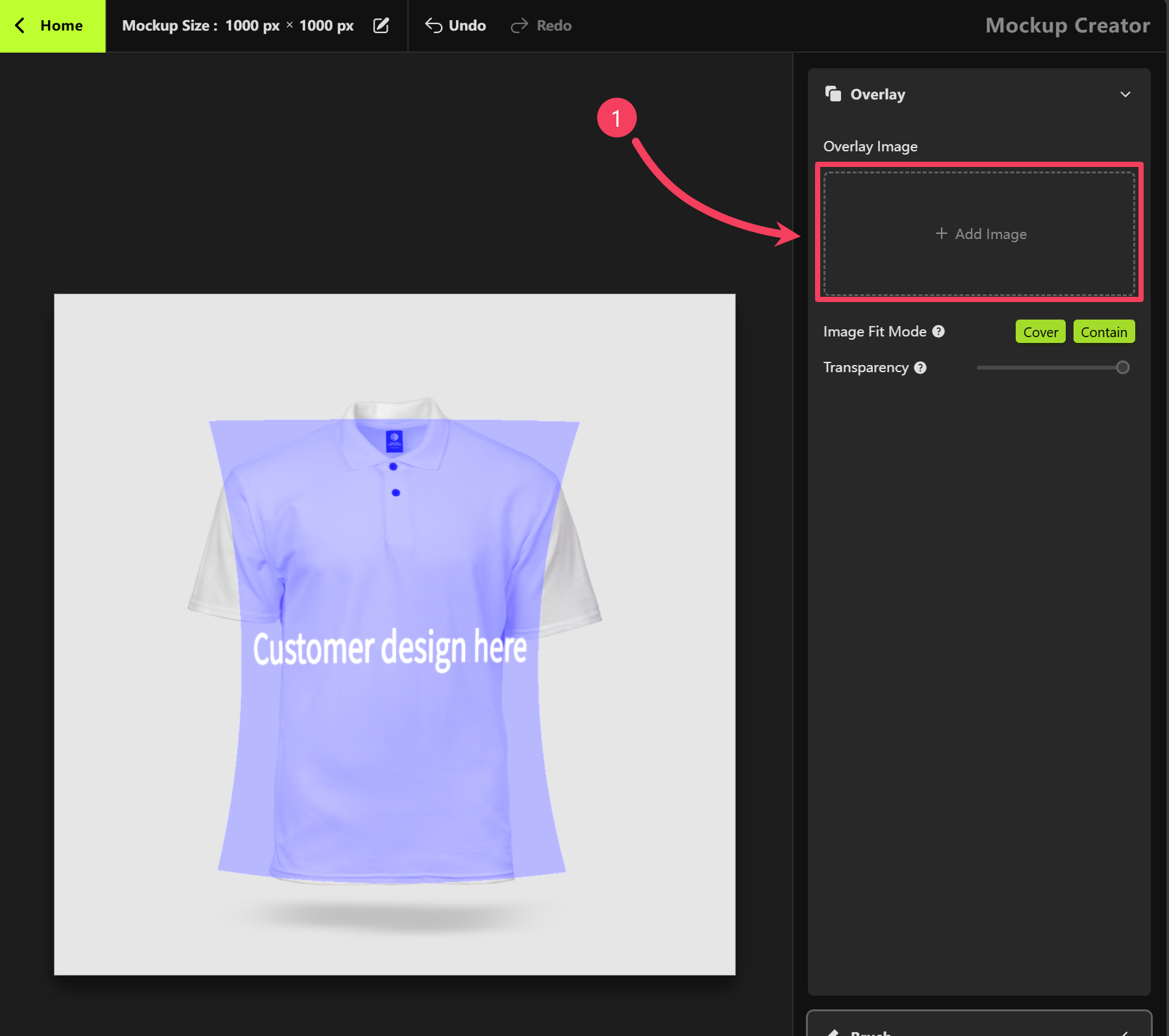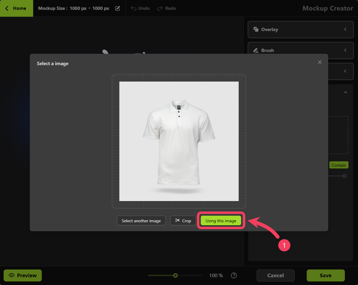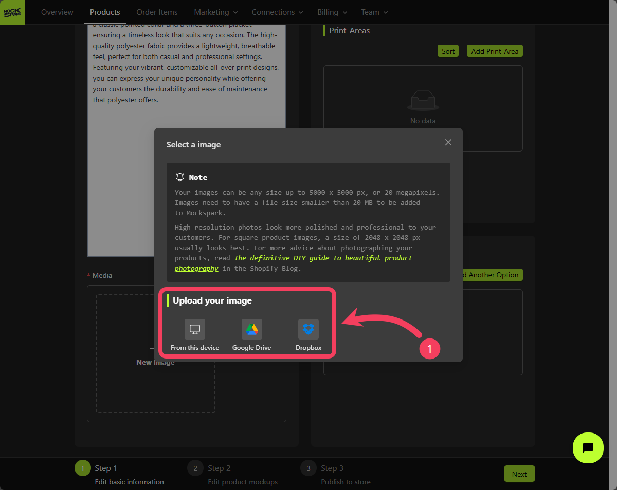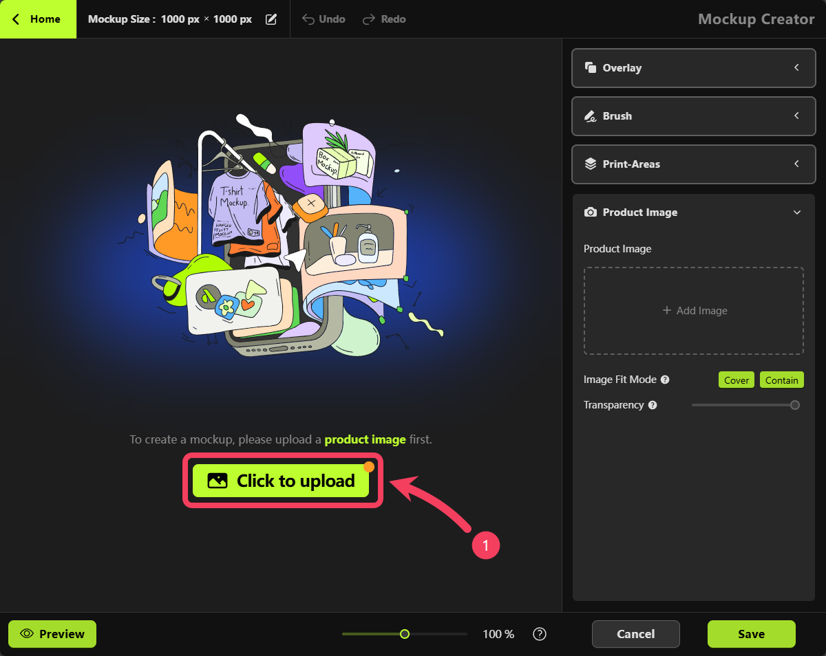 To create a mockup, begin by clicking the button shown in the image below to upload a product photo.