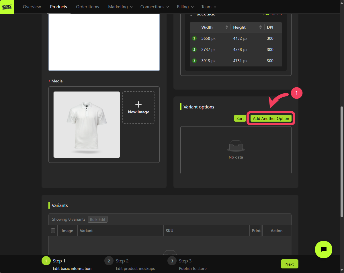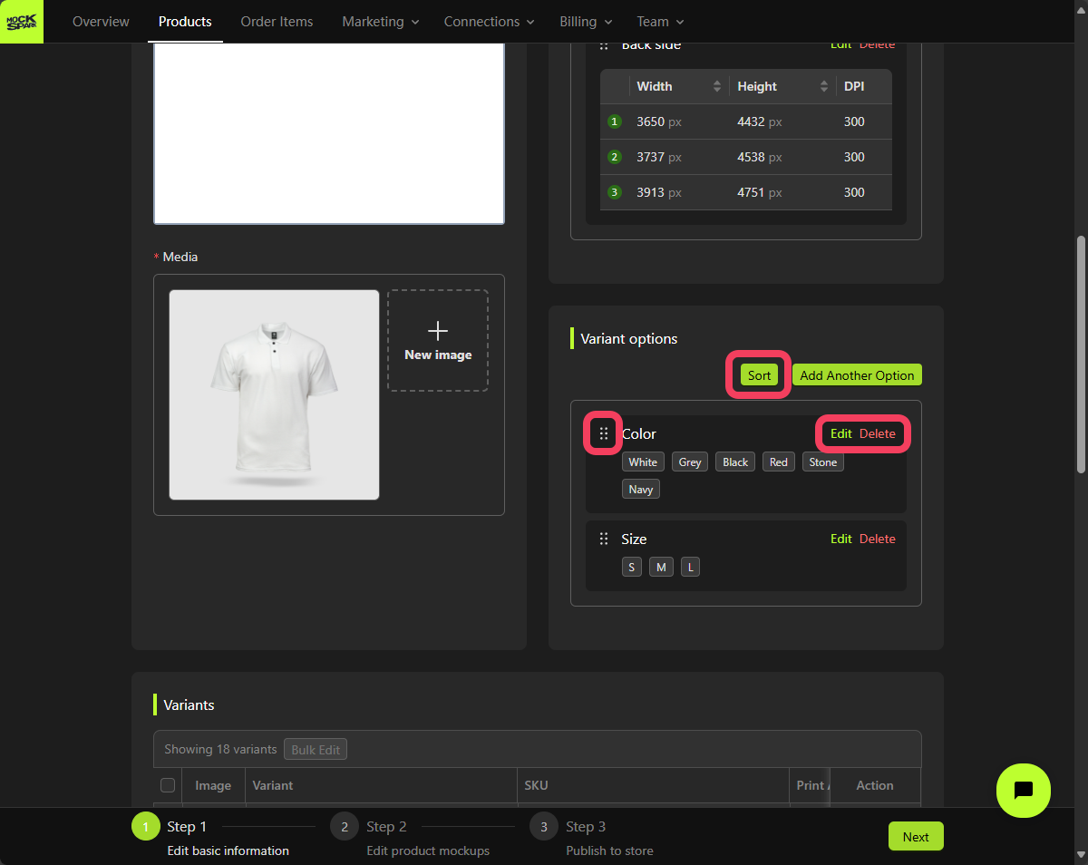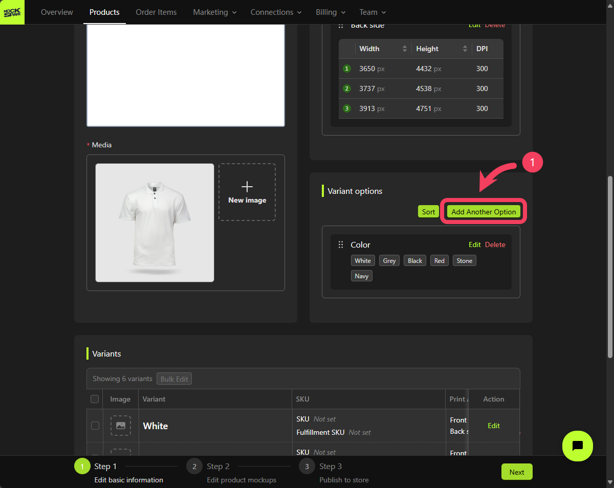 Now that we’ve finished setting up the Print-Areas for this product, let’s move on to creating its Variant options. Each product can have up to three variant options. Combinations of these options define all the possible variations of the product. In this tutorial, we will create two options for variants: one forColor and one for Size.