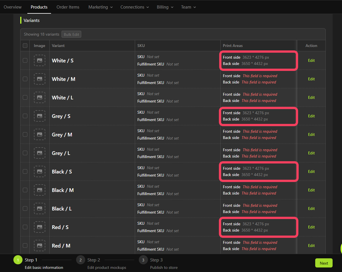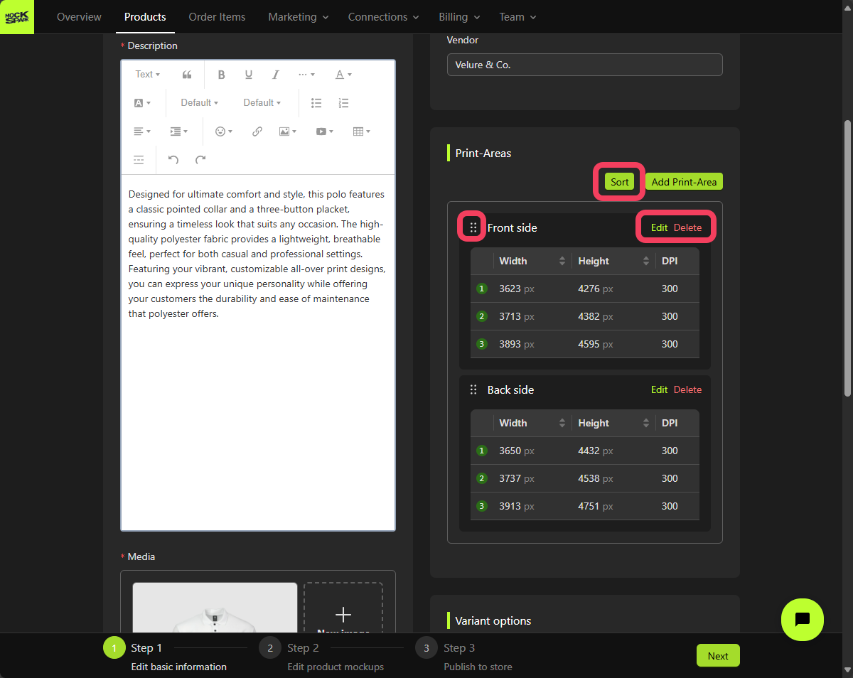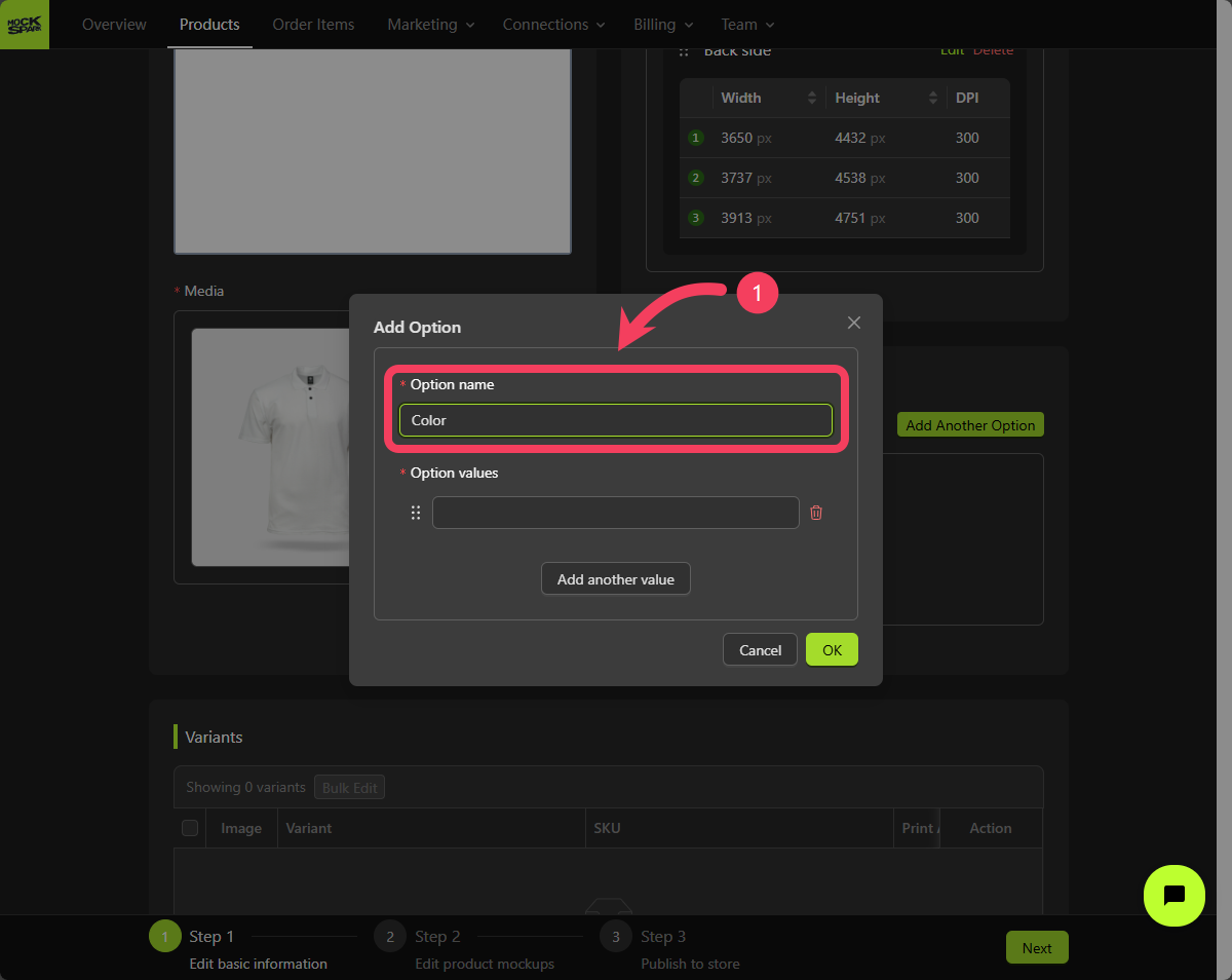Now that we’ve finished setting up the Print-Areas for this product, let’s move on to creating its Variant options. Each product can have up to three variant options. Combinations of these options define all the possible variations of the product. In this tutorial, we will create two options for variants: one forColor and one for Size.