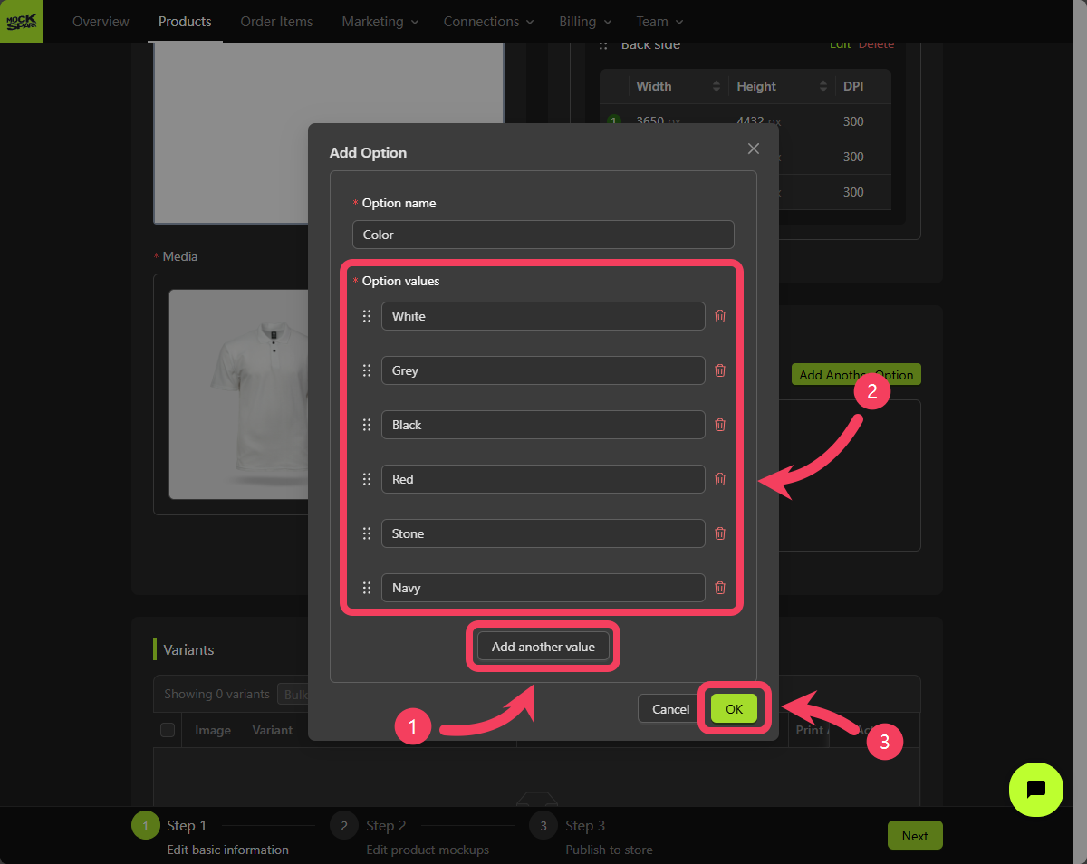 White,Grey,Black,Red,Stone, andNavy. - Click OK to complete the creation of this variant option.