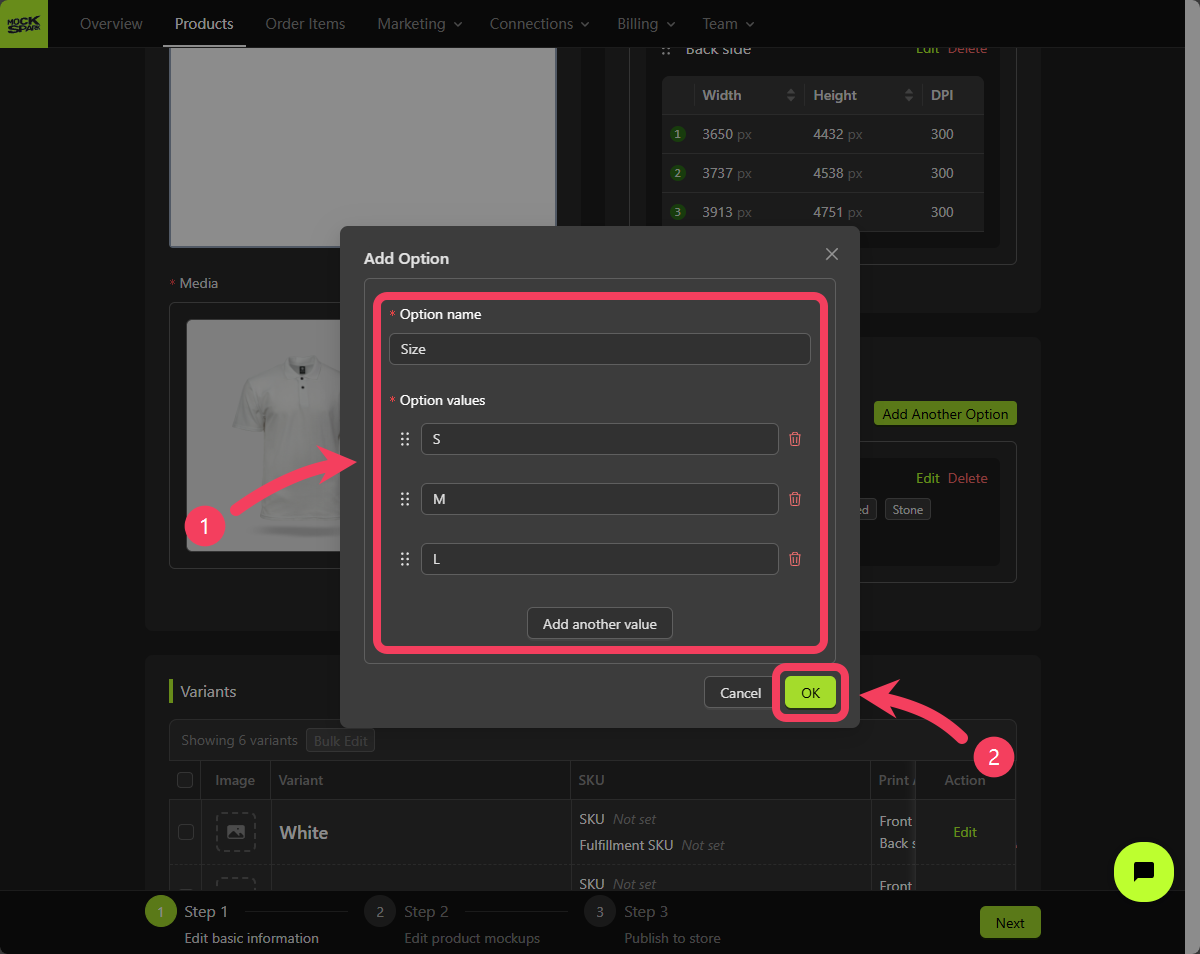 Size, and add 3 value rows to it:S,M, andL. - Click OK to complete the creation of this variant option.