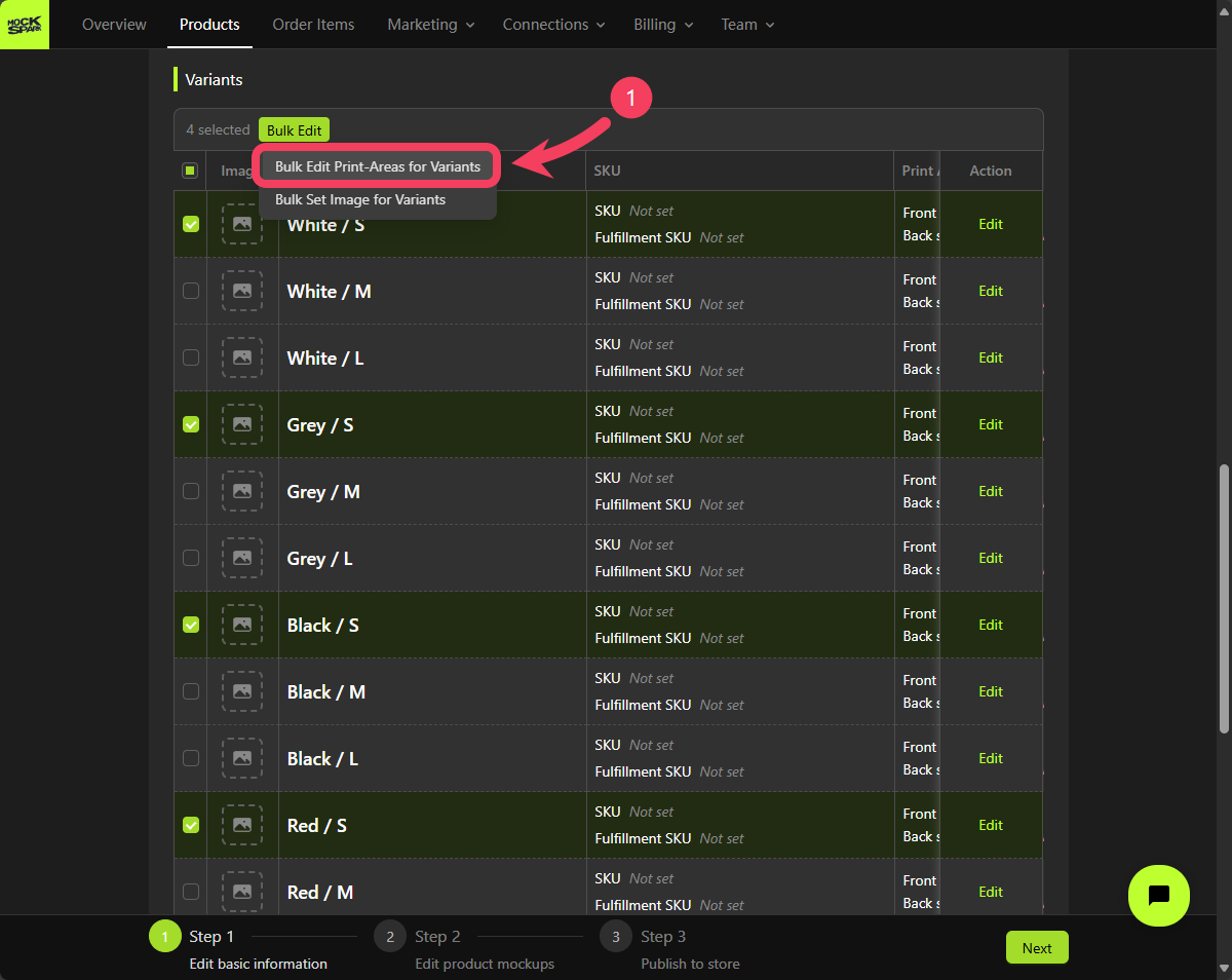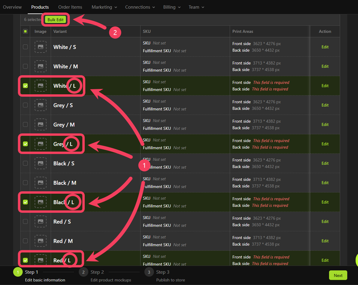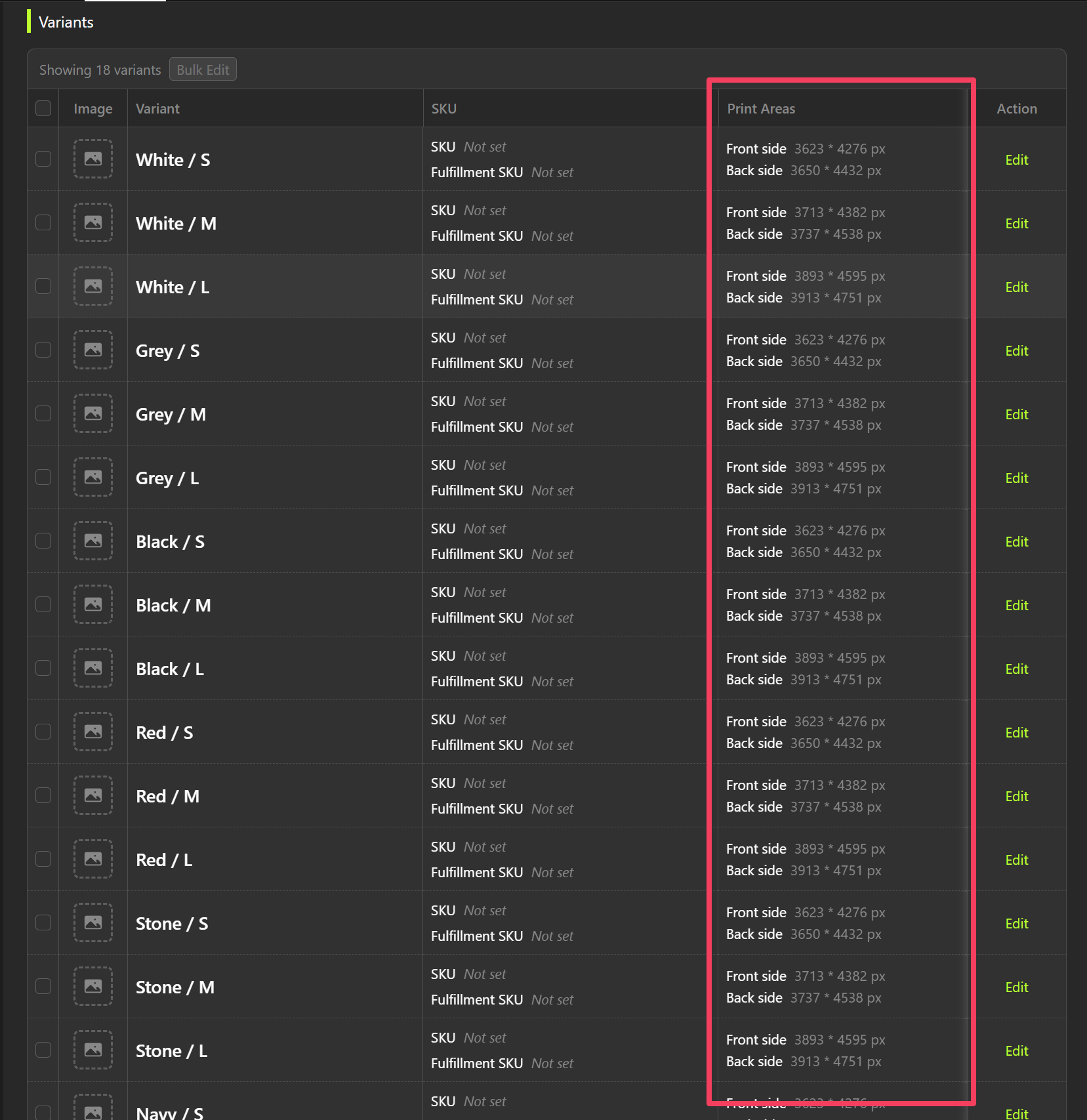 L. - Click Bulk Edit and select Bulk Edit Print Areas for Variants.