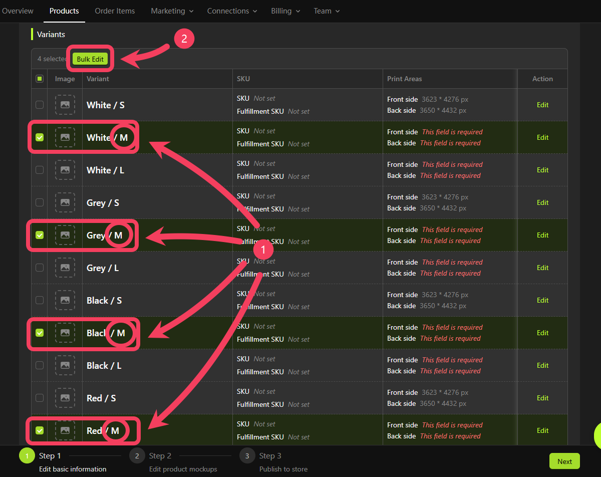 M. - Click Bulk Edit and select Bulk Edit Print Areas for Variants.