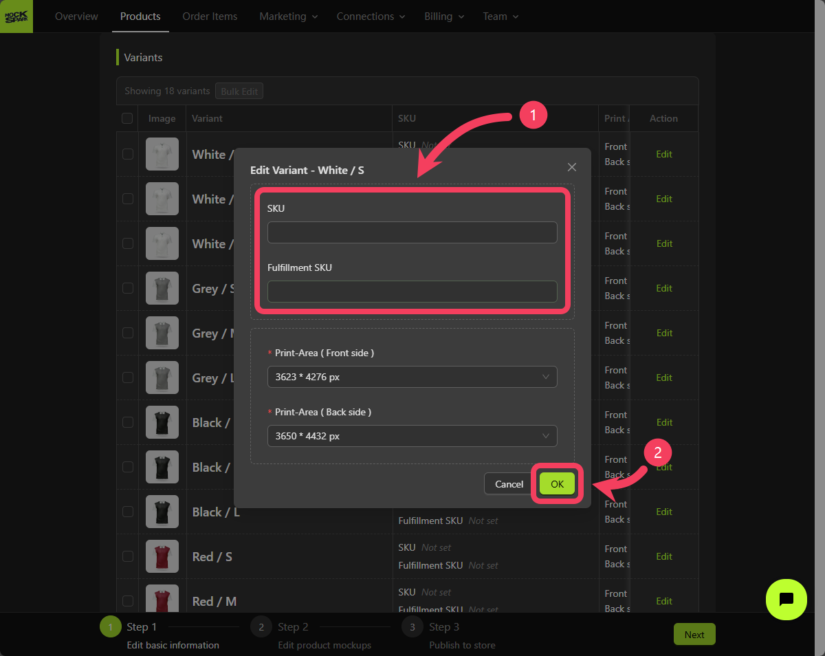 SKUorFulfillment SKUfor a specific variant - Click OK to save your changes.