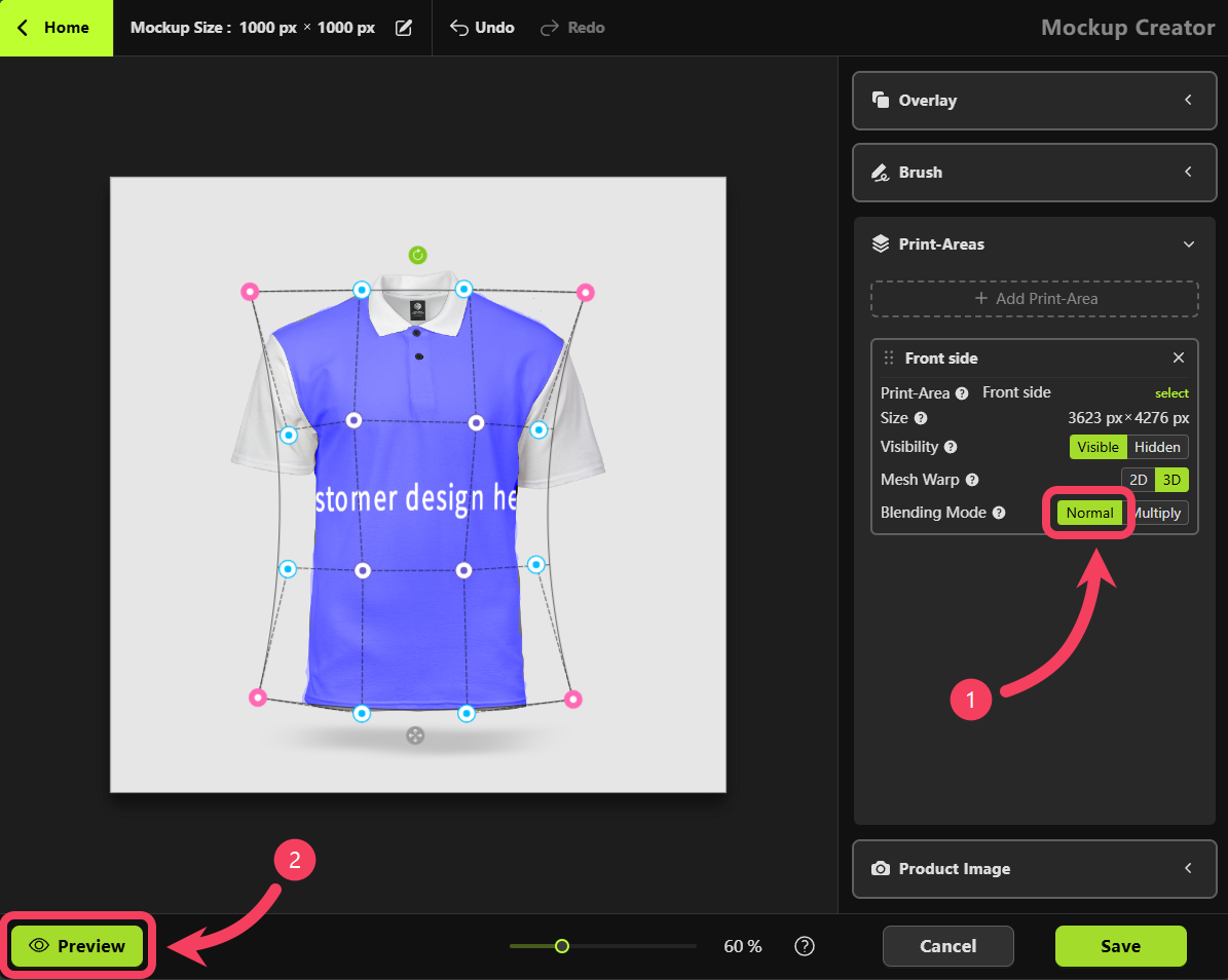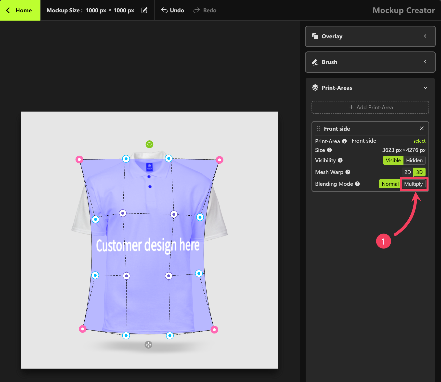 White, we recommend changing the Blending Mode from Normal to Multiply in the Print Areas section on the right-hand panel. This will help enhance the mockup’s visual appearance for a more realistic effect.