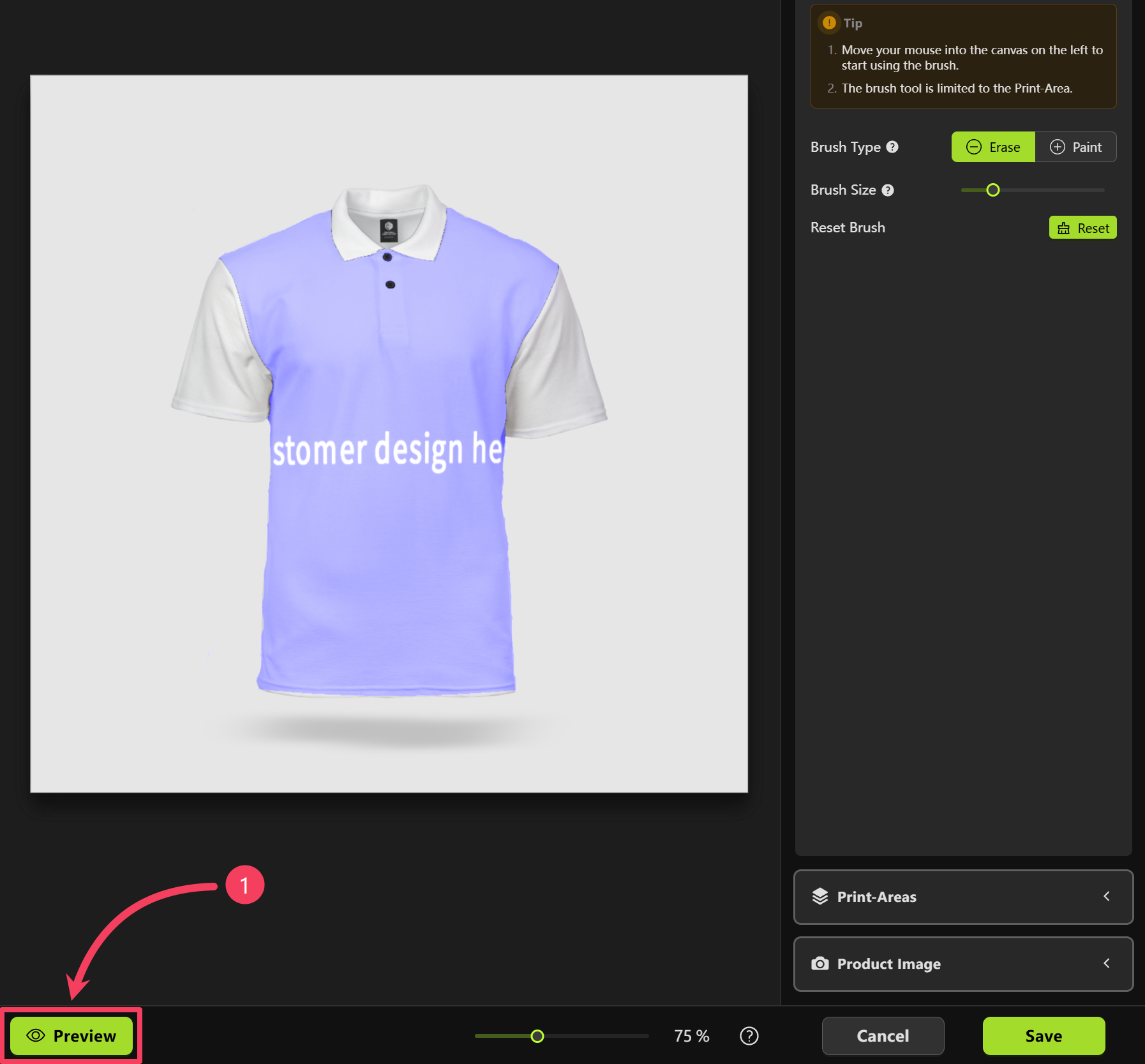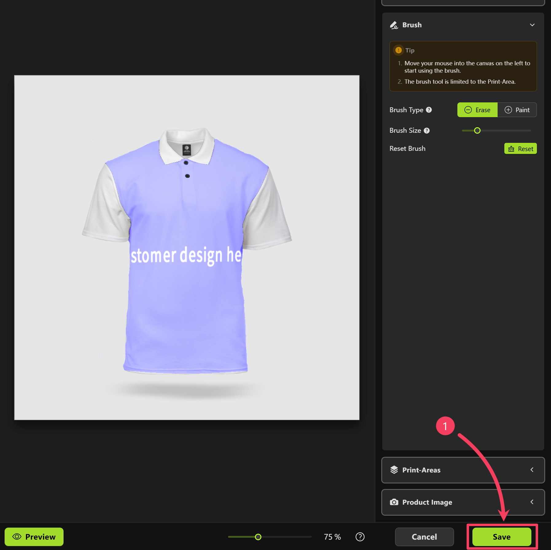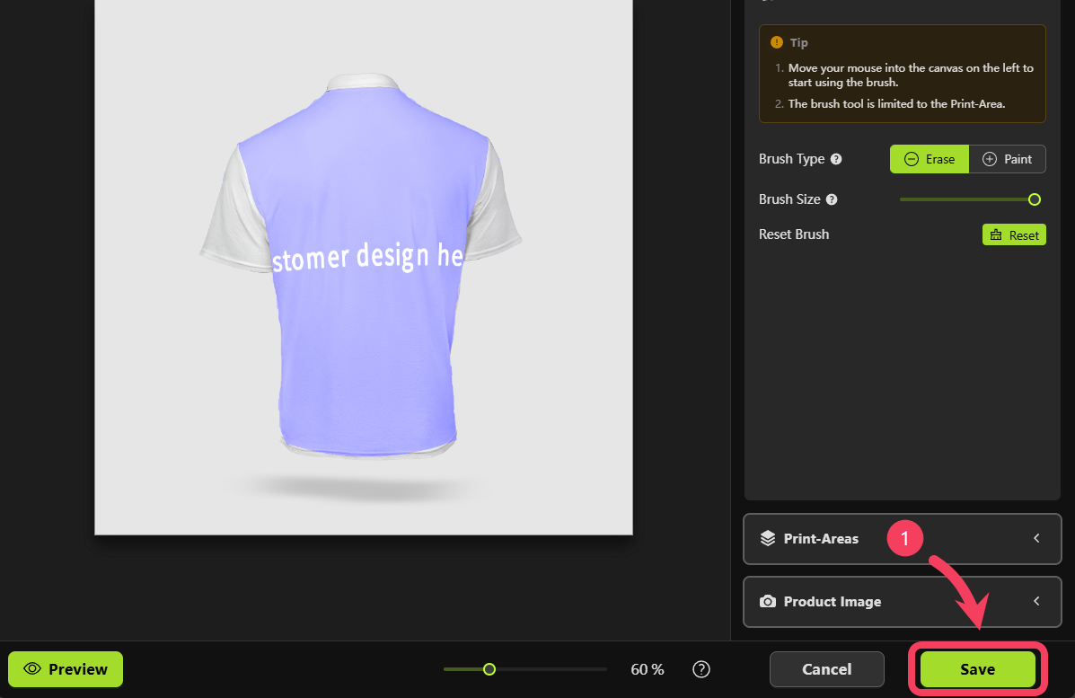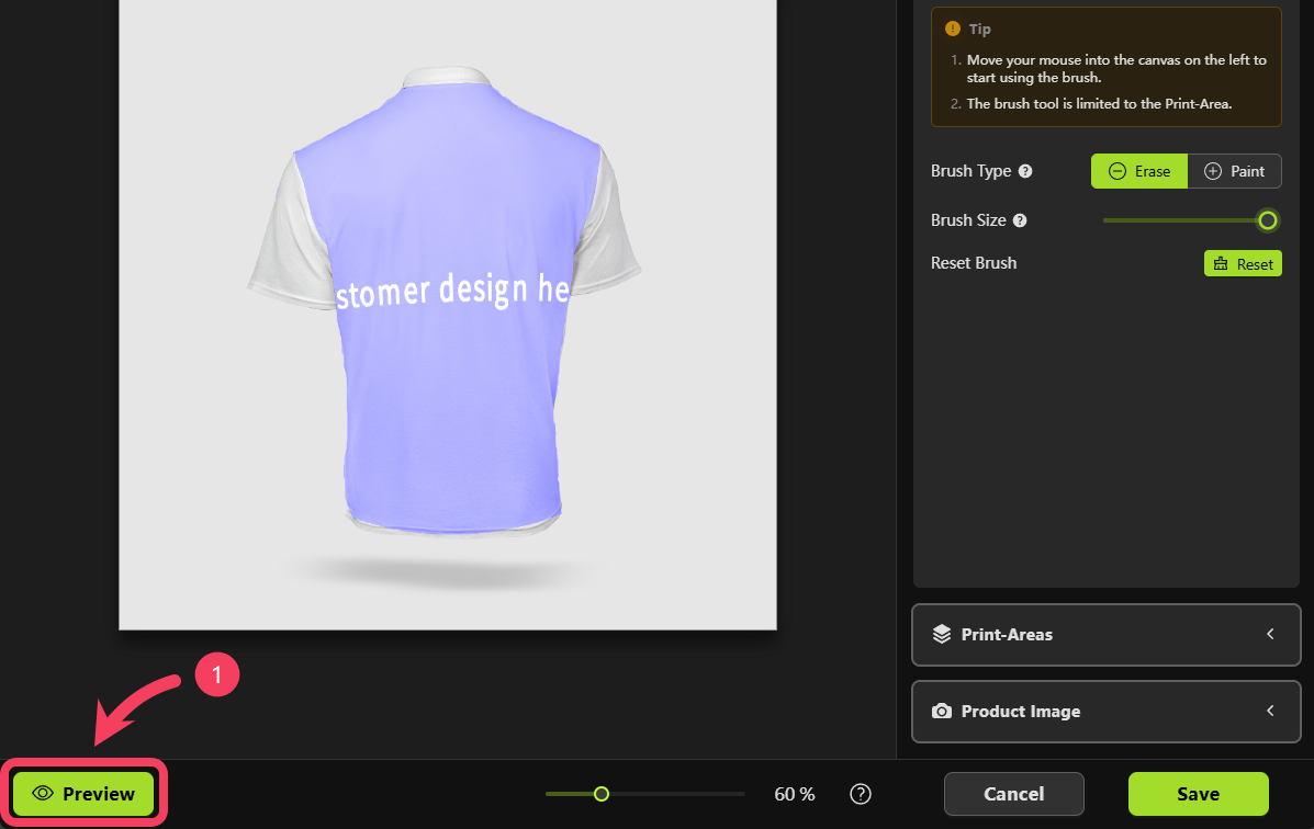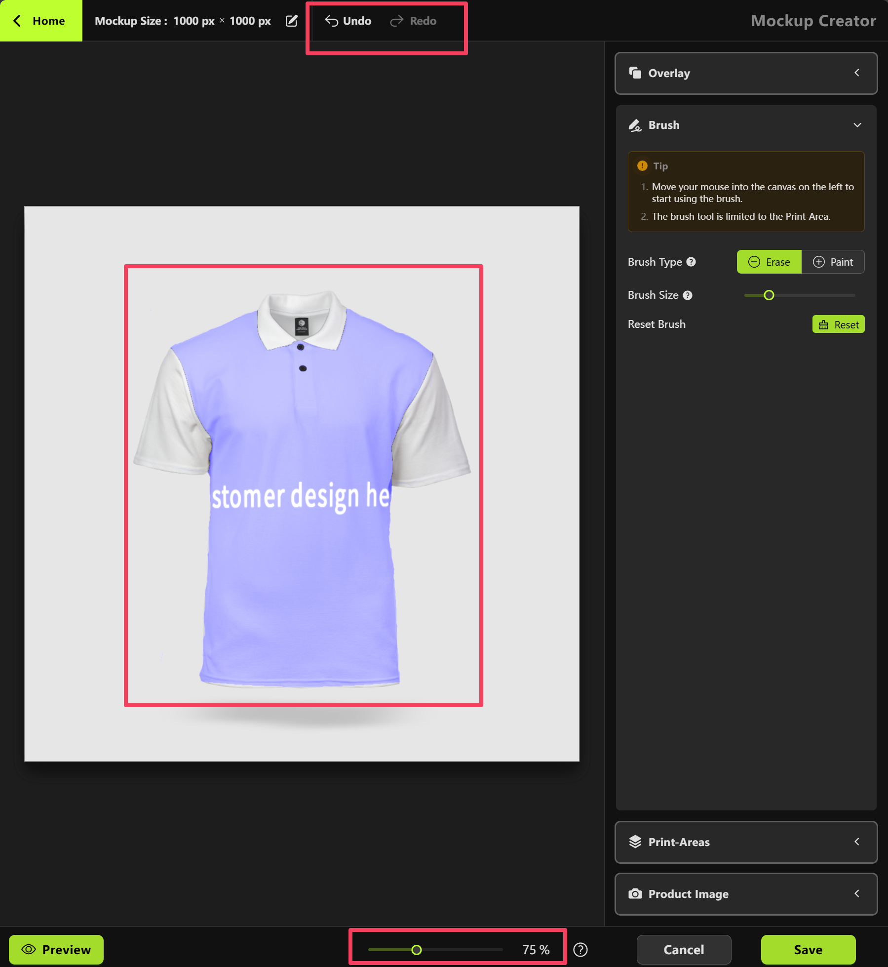 - Move your mouse over to the canvas on the left and use the brush to erase any parts of the print area that you don’t want shown in the mockup.
