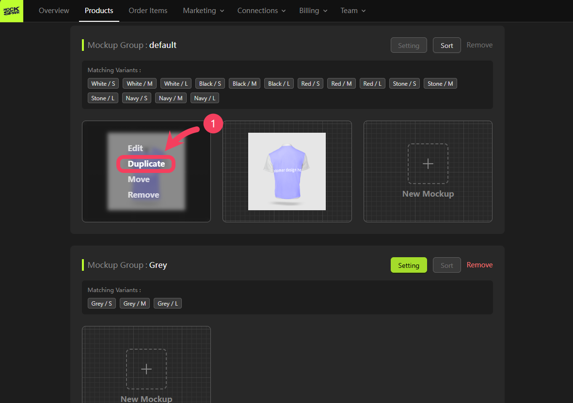 Click Duplicate on the back mockup of the White product within the default Mockup Group.