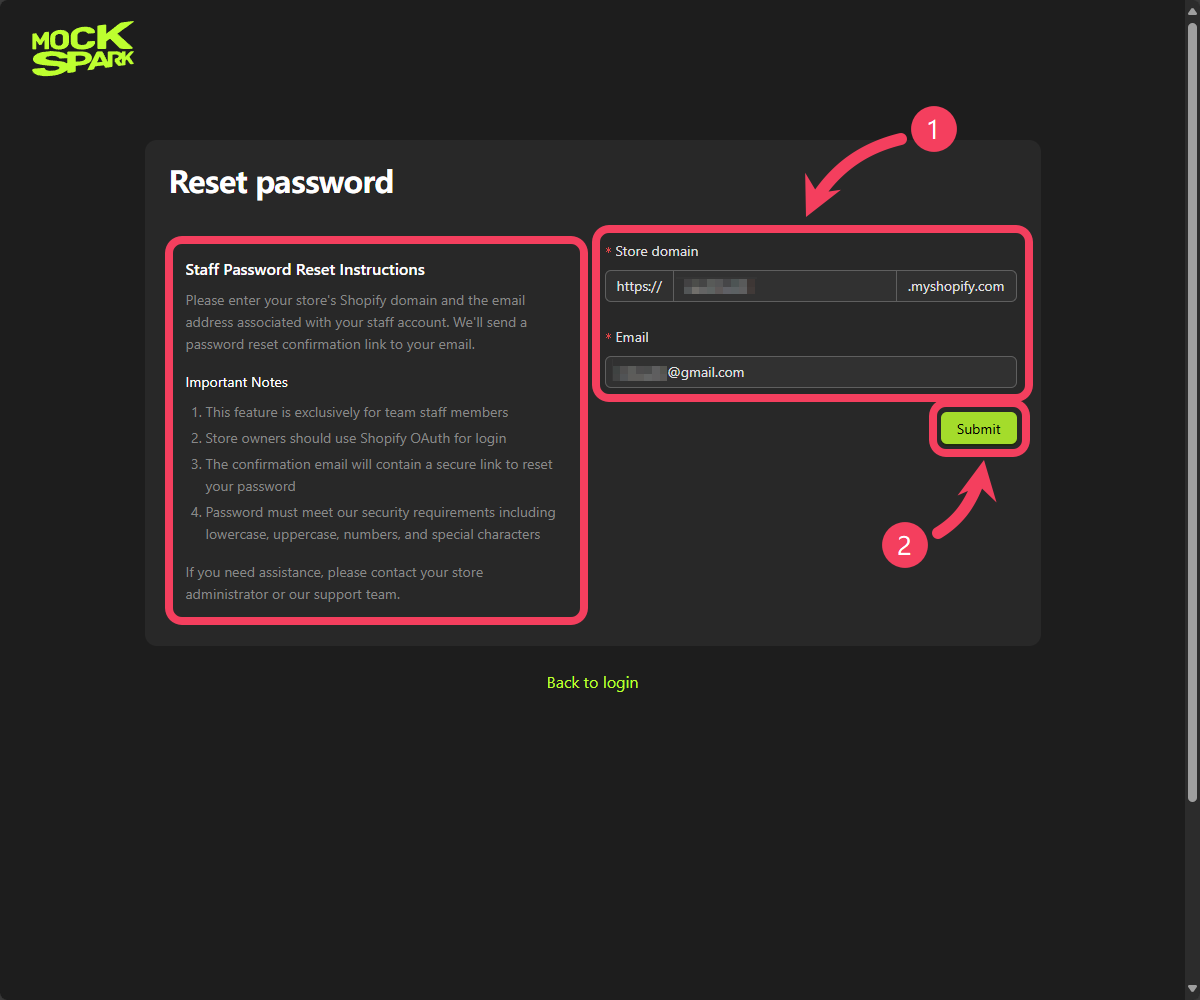 Shopify domainof their store along with theemail addressassociated with their account. A password reset confirmation link will be sent to thatemail. - Click Submit to send your request.